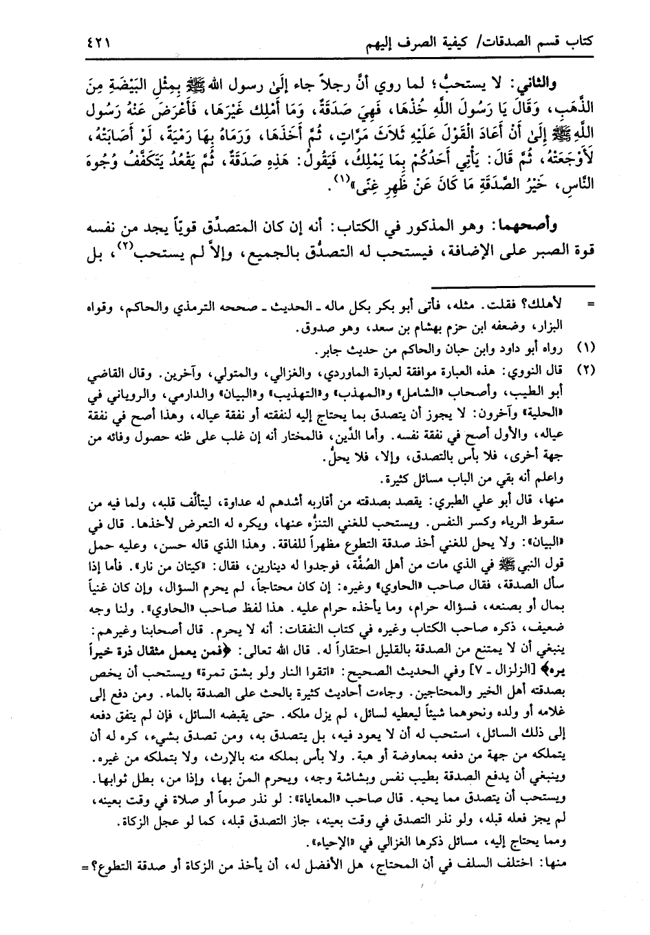 (¬2) قال النووي: هذه العبارة موافقة لعبارة الماوردي، والغزالي، والمتولي، وآخرين. وقال القاضي أبو الطيب، وأصحاب "الشامل" و"المهذب" و"التهذيب" و"البيان" والدارمي، والروياني في "الحلية"، وآخرون: لا يجوز أن يتصدق بما يحتاج إليه لنفقته أو نفقة عياله، وهذا أصح في نفقة عياله، والأول أصح في نفقة نفسه. وأما الدَّين، فالمختار أنه إن غلب على ظنه حصول وفائه من جهة أخرى، فلا بأس بالتصدق، وإلا، فلا يحلُّ.
