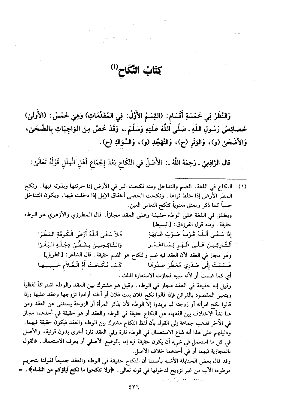 (¬1) النكاح في اللغة. الضم والتداخل ومنه نكحت البر في الأرض إذا حرثتها وبذرته فيها. ونكح المطر الأرض إذا خلط ثراها. ونكحت الحصى أخفاق الإبل إذا دخلت فيها. ويكون التداخل حسياً كما ذكر ومعتق معنوياً كنكح النعاس العين.