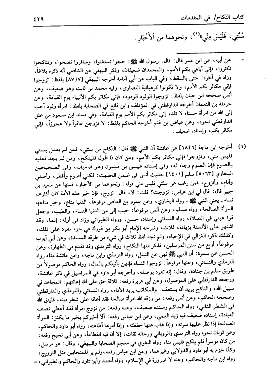 (¬1) أخرجه ابن ماجة [1846] عن عائشة أن النبي -صلى الله عليه وسلم- قال: النكاح من سنتي، فمن لم يعمل بسنتي فليس منى، وتزوجوا فإني مكاثر بكم الأمم، ومن كان ذا طول فلينكح، ومن لم يجد فعليه بالصوم فإن الصوم وجاء له، وفي إسناده عيسى بن ميمون وهو ضعيف، وفي الصحيحين البخاري [5063] سلم [1401] حديث أنس في ضمن الحديث: لكني أصوم وأفطر، وأصلي وأنام، وأتزوج، فمن رغب عن سنّتي فليس منى قوله: ونحوهما من الأخبار، فمنها عن سعيد بن جبير قال: قال لي ابن عباس: تزوجت؟ قلت: لا، قال: تزوج، فإن خير هذه الأمة كان أكثرهم نساء -يعني النبي -صلى الله عليه وسلم- رواه البخاري، وعن عمرو بن العاص مرفوعاً، الدنيا متاع، وخير متاعها المرأة الصالحة، رواه مسلم، وعن أنس مرفوعاً: حبب إلى من الدنيا النساء، والطيب، وجعل قرة عيني في الصلاة، رواه النسائي وإسناده حسن. ورواه الطبراني وزاد في أوله: إنما، وقد اشتهر على الألسنة بزيادة، ثلاث، وشرحه الإمام أبو بكر بن فورك في جزء مفرد على ذلك، وكذلك ذكره الغزالي في الإِحياء، ولم نجد لفظ ثلاث في شيء من طرقه المسندة، وعن أبي أيوب مرفوعاً، أربع من سنن المرسلين، فذكر منها النكاح، رواه الترمذي وقد تقدم في الطهارة، وعن الحسن عن سمرة: أن النبي -صلى الله عليه وسلم- نهى عن التبتل، رواه الترمذي وابن ماجه، وعن عائشة مثله رواه الترمذي والنسائي، وعنها مرفوعاً: تزوجوا النساء فإنهن يأتينكم بالمال، رواه الحاكم موصولاً من طريق سلم بن جنادة، وقال: إنه تفرد بوصله، وأخرجه أبو داود في المراسيل في ذكر عائشة، ورجحه الدارقطني على الموصول، وعن أبي هريرة رفعه: ثلاثة حق على الله إعانتهم: المجاهد في سبيل الله، والناكح يريد أن يستعف. والمكاتب يريد الأداء، رواه النسائي والترمذي والدارقطني وصححه الحاكم، وعن أنس رفعه من رزقه الله امرأة صالحة فقد أعانه على شطر دينه، فليتقِ الله في الشطر الثاني، رواه الحاكم وسنده ضعيف، وعنه رفعه: من تزوج امرأة فقد أعطي نصف العبادة، إسناده ضعيف فيه زيد العمي، وعن ابن عباس رفعه: ألا أخبركم بخير ما يكنز: المرأة الصالحة إذا نظر عليها سرته، وإذا غاب عنها حفظته، وإذا أمرها أطاعته، رواه أبو داود والحاكم، وعن ثوبان نحوه رواه الترمذي والروياني ورجاله ثقات، إلا أن فيه انقطاعاً، وعن أبي نجيح رفعه: من كان موسراً فلم ينكح فليس منا، رواه البغوي في معجم الصحابة والبيهقي، وقال: هو مرسل، وكذا جزم به أبو داود والدولابي وغيرهما، وعن ابن عباس رفعه، ولم ير للمتحابين مثل التزويج، رواه ابن ماجه والحاكم، وعنه لا ضرورة في الإِسلام، رواه أحمد وأبو داود والحاكم والطبراني، =