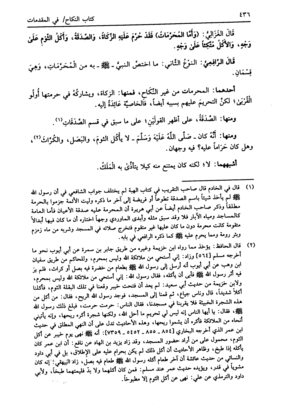 قَالَ الغَزَالِيُّ: (وَأَمَّا المُحَرَّمَاتُ) فَقَدْ حُرِّمَ عَلَيْهِ الزَّكَاةُ، وَالصَّدَقَةُ، وَأَكْلُ الثَّوْمِ عَلَى وَجْهٍ، وَالأَكْلُ مُتَّكِئاً عَلَى وَجْهٍ.