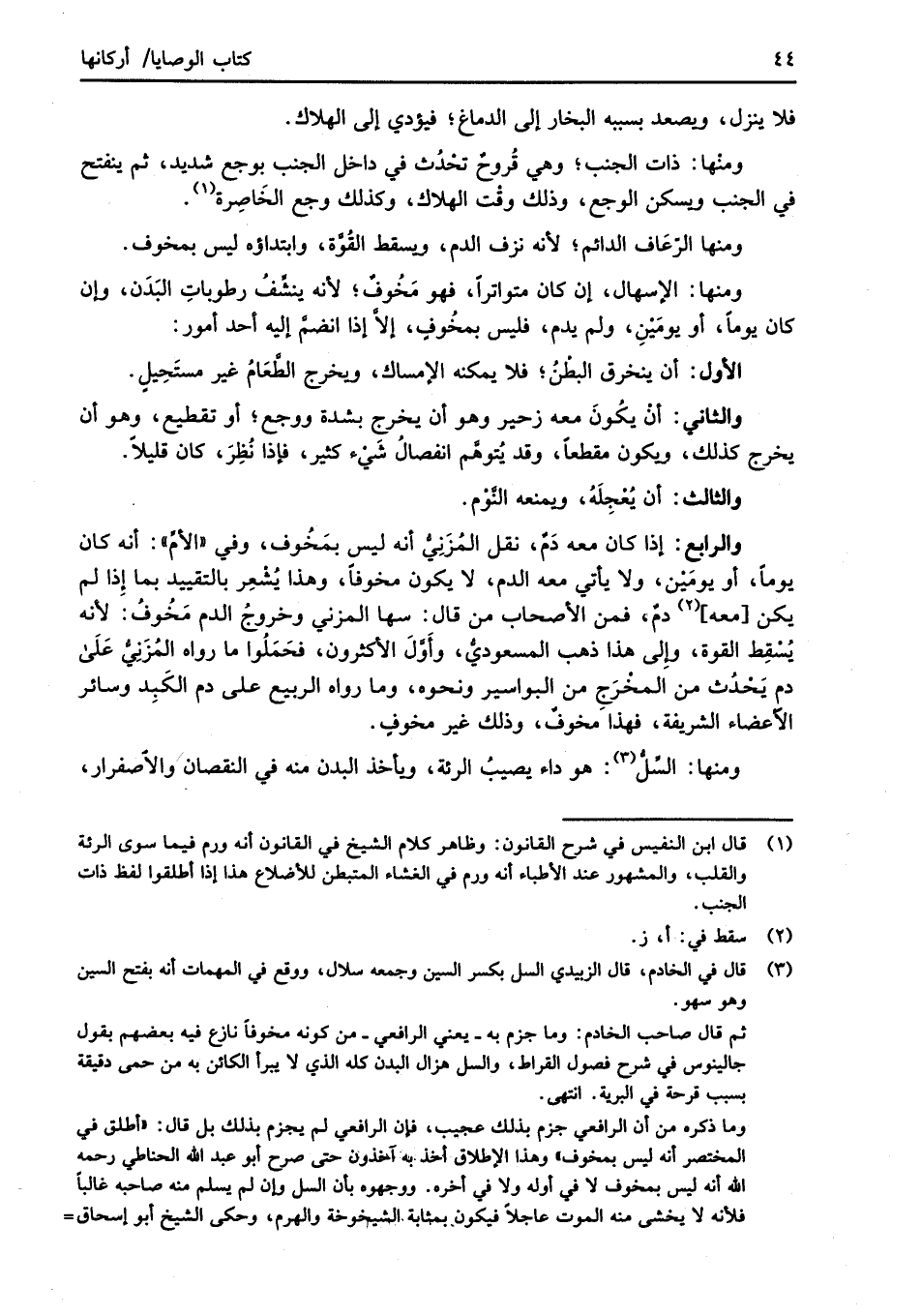 والرابع: إذا كان معه دَمٌ، نقل المُزَنِيُّ أنَّه ليس بمَخُوف، وفي "الأمِّ": أنه كان يوماً، أو يومَيْن، ولا يأتي معه الدم، لا يكون مخوفاً، وهذا يُشْعِر بالتقييد بما إِذا لم يكن [معه] (¬2) دمٌ؛ فمن الأصحاب من قال: سها المزني وخروجُ الدم مَخُوفُ: لأنه يُسْقِط القوة، وإِلى هذا ذهب المسعوديُّ، وأَوَّلَ الأكثرون، فحَمَلُوا ما رواه المُزَنِيُّ عَلَى دم يَحْدُث من المخْرَجِ من البواسير ونحوه، وما رواه الربيع على دم الكَبِد وسائر الأعضاء الشريفة، فإذا مخوفٌ، وذلك غير مخوفٍ.