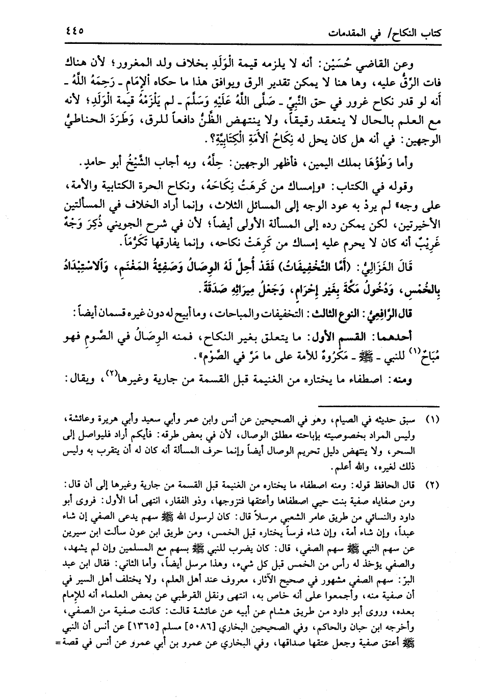 (¬2) قال الحافظ قوله: ومنه اصطفاء ما يختاره من الغنيمة قبل القسمة من جارية وغيرها إلى أن قال: ومن صفاياه صفية بنت حيي اصطفاها وأعتقها فتزوجها، وذو الفقار، انتهى أما الأول: فروى أبو داود والنسائي من طريق عامر الشعبي مرسلاً قال: كان لرسول الله -صلى الله عليه وسلم- سهم يدعى الصفي إن شاء عبداً، وإن شاء أمة، وإن شاء فرساً يختاره قبل الخمس، ومن طريق ابن عون سألت ابن سيرين عن سهم النبي -صلى الله عليه وسلم- سهم الصفي، قال: كان يضرب للنبي -صلى الله عليه وسلم- بسهم مع المسلمين وإن لم يشهد، والصفي يؤخذ له رأس من الخمس قبل كل شيء، وهذا مرسل أيضاً، وأما الثاني: فقال ابن عبد البرّ: سهم الصفي مشهور في صحيح الآثار، معروف عند أهل العلم، ولا يختلف أهل السير في أن صفية منه، وأجمعوا على أنه خاص به، انتهى ونقل القرطبي عن بعض العلماء أنه للإِمام بعده، وروى أبو داود من طريق هشام عن أبيه عن عائشة قالت: كانت صفية من الصفي، وأخرجه ابن حبان والحاكم، وفي الصحيحين البخاري [5086] مسلم [1356] عن أنس أن النبي -صلى الله عليه وسلم- أعتق صفية وجعل عتقها صداقها، وفي البخاري عن عمرو بن أبي عمرو عن أنس في قصة =