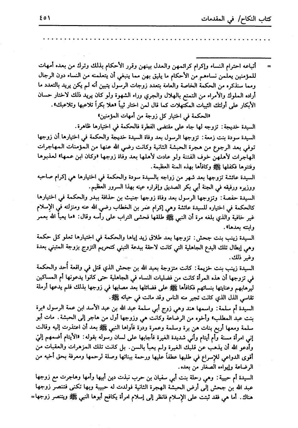 = أتباعه احترام النساء وإكرام كرائمهن والعدل بينهن وقرر الأحكام بذلك وترك من بعده أمهات للمؤمنين يعلمن نساءهم من الأحكام ما يليق بهن مما ينبغي أن يتعلمنه من النساء دون الرجال ومما سنذكره من الحكمة الخاصة والعامة بتعدد زوجات الرسول يتبين أنه لم يكن يريد بالتعدد ما أراده الملوك والأمراء من التمتع بالهلال والجري وراء الشهوة ولو كان يريد ذلك لاختار حسان الأبكار على أولئك الثيبات المكتهلات كما قال لمن اختار ثيباً "هلا بكراً تلاعبها وتلاعبك".