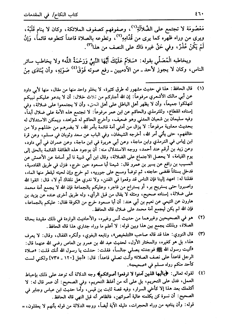 (¬4) لقوله تعالى: {يَاأَيُّهَا الَّذِينَ آمَنُوا لَا تَرْفَعُوا أَصْوَاتَكُمْ} وجه الدلالة أنه توعد على ذلك بإحباط العمل، فدل على التحريم، بل على أنه من أغلظ التحريم، وفي الصحيح: أن عمر قال له: لا أكلمك، بعد هذا إلا كأخي السرار، وفيه قصة ثابت بن قيس، وأما حديث ابن عباص وجابر في الصحيح: أن نسوةكن يكلمنه عالية أصواتهن، فالظاهر أنه قبل النهي قاله الحافظ.