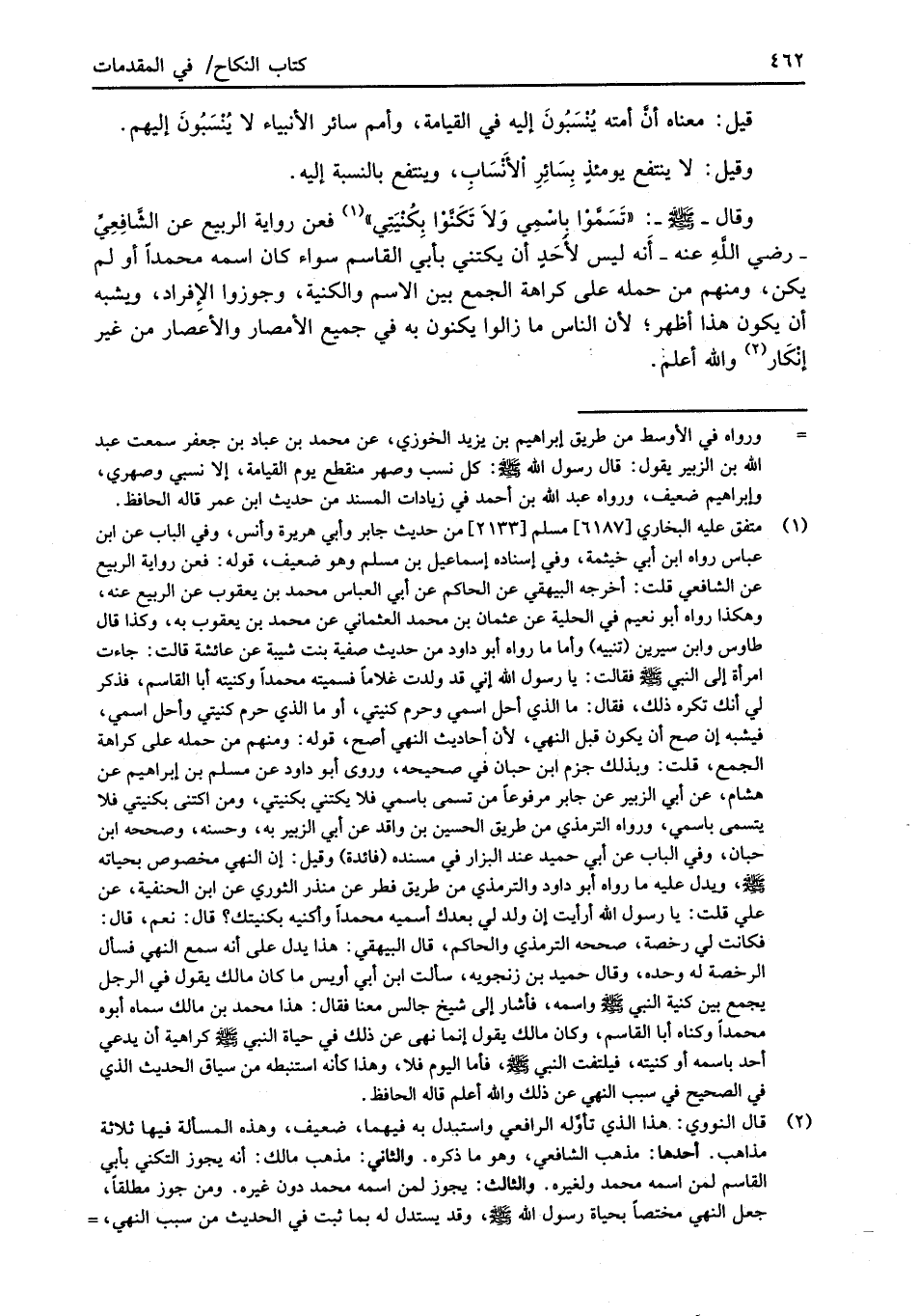 (¬2) قال النووي: هذا الذي تأوَّله الرافعي واستبدل به فيهما، ضعيف، وهذه المسألة فيها ثلاثة مذاهب. أحدها: مذهب الشَّافعي، وهو ما ذكره. والثاني: مذهب مالك: أنه يجوز التكني بأبي القاسم لمن اسمه محمد ولغيره. والثالث: يجوز لمن اسمه محمد دون غيره. ومن جوز مطلقاً، جعل النهي مختصاً بحياة رسول الله -صلى الله عليه وسلم-، وقد يستدل له بما ثبت في الحديث من سبب النهي، =