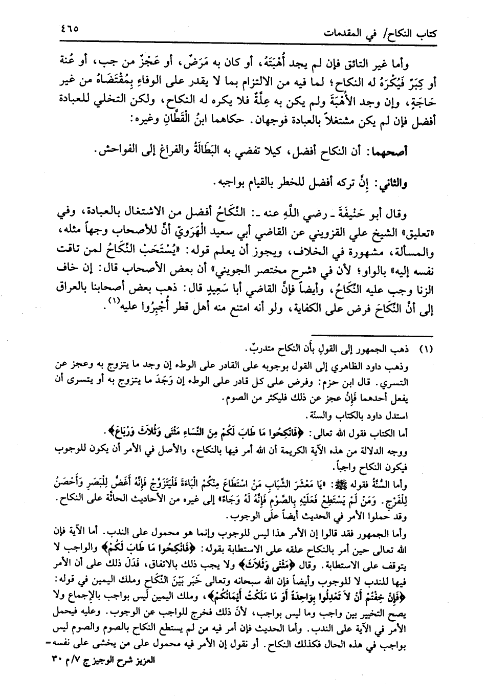 وأما الجمهور فقد قالوا إن الأمر هذا ليس للوجوب وإنما هو محمول على الندب. أما الآية فإن الله تعالى حين أمر بالنكاح علقه على الاستطابة بقوله: {فَانْكِحُوا مَا طَابَ لَكُمْ} والواجب لا يتوقف على الاستطابة. وقال {مَثْنَى وَثُلَاثَ} ولا يجب ذلك بالاتفاق، فَدَلَ ذلك على أن الأمر فيها للندب لا للوجوب وأيضاً فإن الله سبحانه وتعالى خَبَر بَيْنَ النِّكَاحِ وملك اليمين في قوله: {فَإِنْ خِفْتُمْ أَلَّا تَعْدِلُوا فَوَاحِدَةً أَوْ مَا مَلَكَتْ أَيْمَانُكُمْ} وملك اليمين ليس بواجب بالإِجماع ولا يصح التخيير بين واجب وما ليس بواجب، لأنَ ذلك فخرج للواجب عن الوجوب. وعليه فيحمل الأمر في الآية على الندب. وأما الحديث فإن أمر فيه من لم يستطع النكاح بالصوم والصوم ليس بواجب في هذه الحال فكذلك النكاح. أو نقول إن الأمر فيه محمول على من يخشى على نفسه =