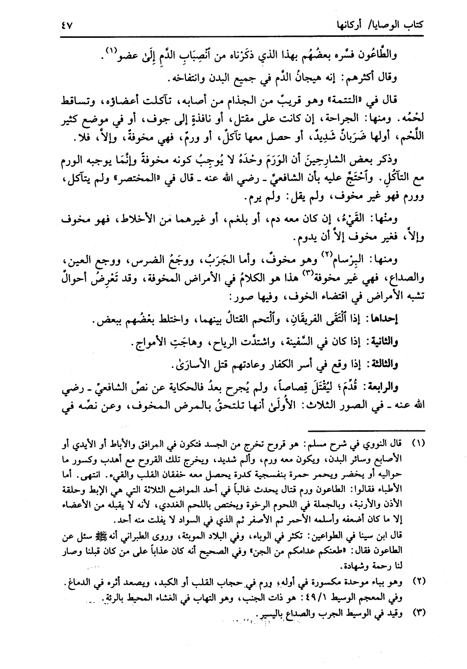 (¬1) قال النووي في شرح مسلم: هو قروح تخرج من الجسد فتكون في المرافق والأباط أو الأيدي أو الأصابع وسائر البدن، ويكون معه ورم، وألم شديد، ويخرج تلك القروح مع أهدب وكسور ما حواليه أو يخضر ويحمر حمرة بنفسجية كدرة يحصل معه خفقان القلب والقيء. انتهى. أما الأطباء فقالوا: الطاعون ورم قتال يحدث غالباً في أحد المواضع الثلاثة التي هي الإبط وحلقة الأذن والأرنبة، وبالجملة في اللحوم الرخوة ويختص باللحم الغددي؛ لأنه لا يقبله من الأعضاء إلا ما كان أضعفه وأسلمه الأحمر ثم الأصفر ثم الذي في السواد لا يفلت منه أحد.