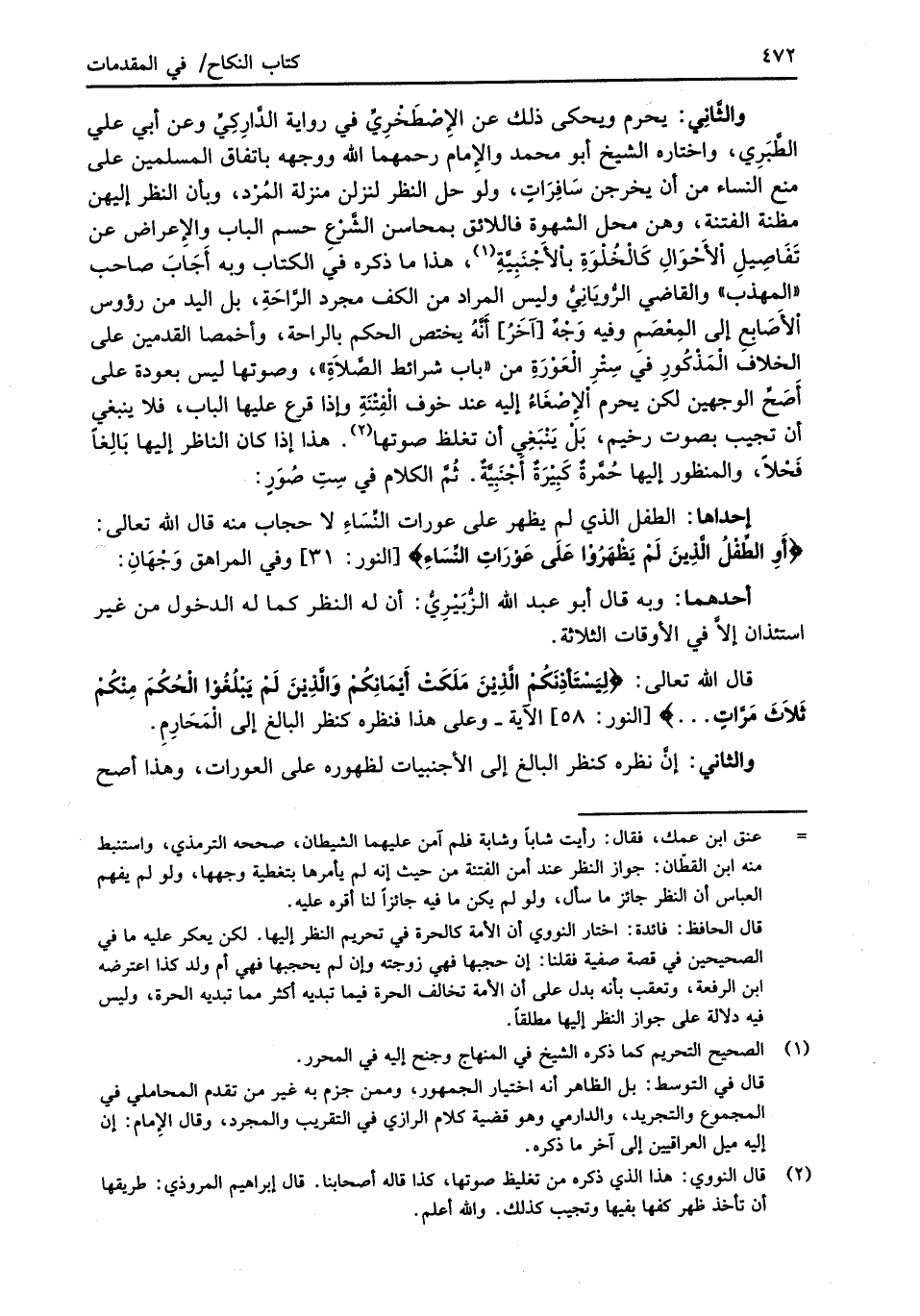إحداها: الطفل الذي لم يظهر على عورات النِّسَاءِ لا حجاب منه قال الله تعالى: {أَوِ الطِّفْلِ الَّذِينَ لَمْ يَظْهَرُوا عَلَى عَوْرَاتِ النِّسَاءِ} [النور: 31] وفي المراهق وَجْهَانِ: