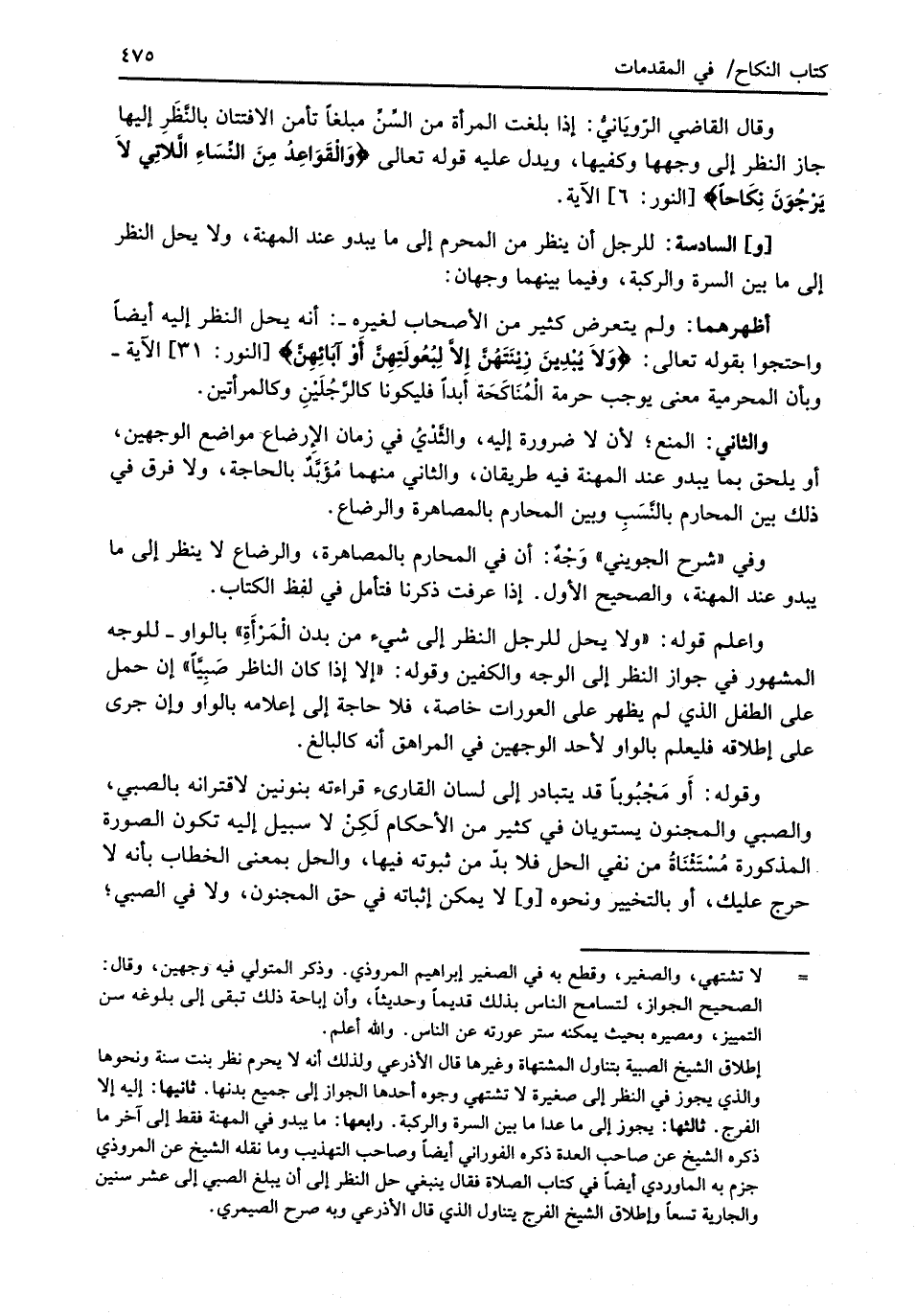 واعلم قوله: "ولا يحل للرجل النظر إلى شيء من بدن الْمَرْأَةِ" بالواو -للوجه المشهور في جواز النظر إلى الوجه والكفين وقوله: "إلا إذا كان الناظر صَبِيَّاً" إن حمل على الطفل الذي لم يظهر على العورات خاصة، فلا حاجة إلى إعلامه بالواو وإن جرى على إطلاقه فليعلم بالواو لأحد الوجهين في المراهق أنه كالبالغ.