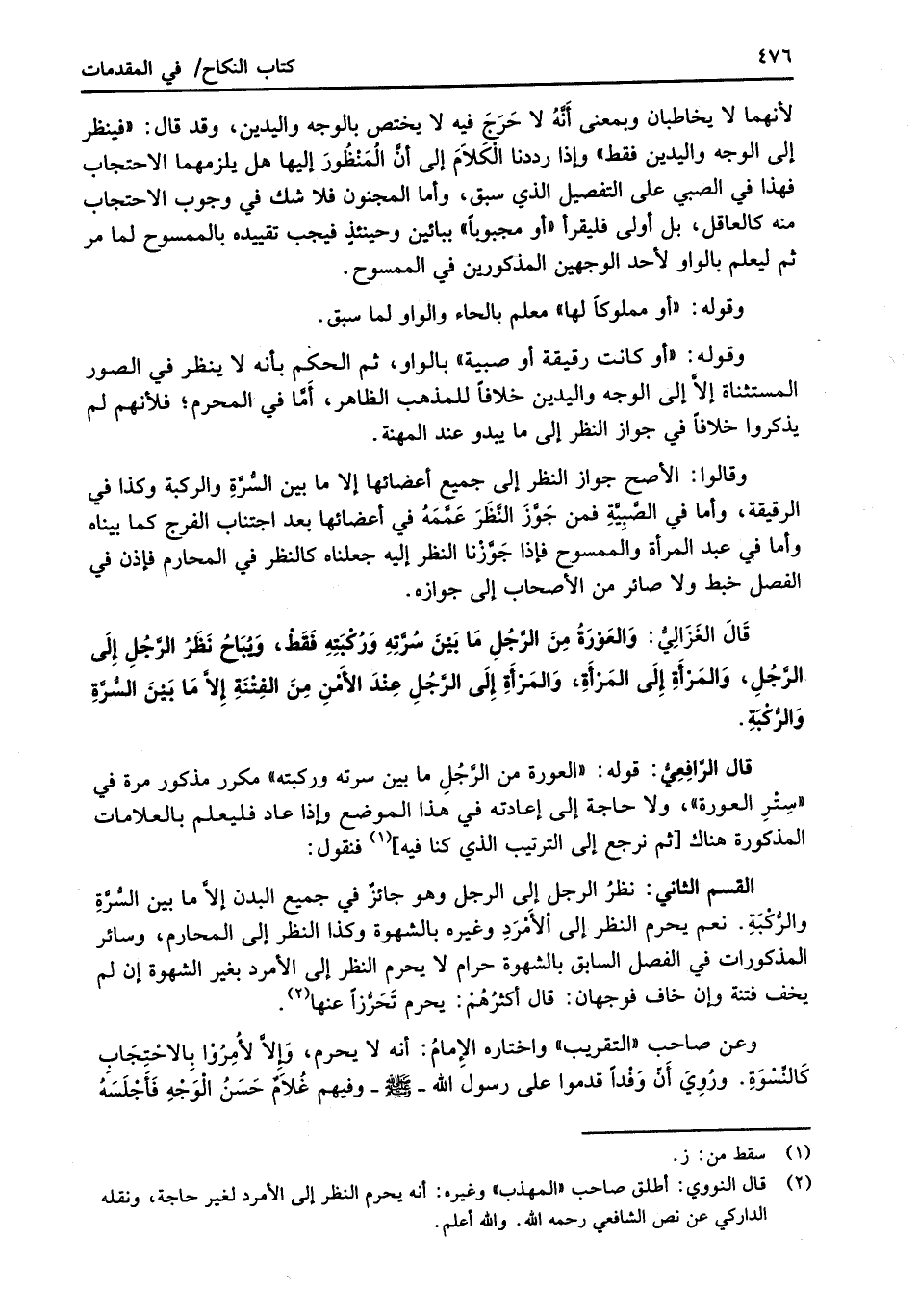 قَالَ الغَزَّالِيُّ: وَالعَوْرَةُ مِنَ الرَّجُلِ مَا بَيْنَ سُرَّتِهِ وَرُكْبَتِهِ فَقَطْ، وَيُبَاحُ نَظَرُ الرَّجُلِ إِلَى الرَّجُلِ، وَالمَرْأَةِ إلَى المَرْأَةِ، وَالمَرْأَةِ إلَى الرَّجُلِ عِنْدَ الأَمْنِ مِنَ الفِتْنَةِ إلاَّ مَا بَيْنَ السُّرَّةِ وَالرُّكْبَةِ.