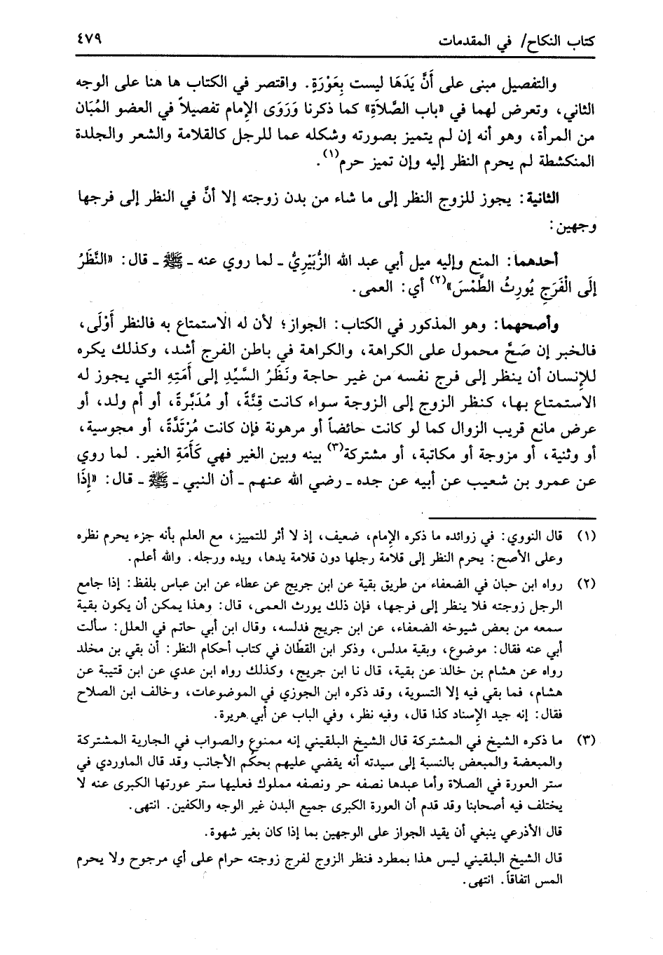 أحدهما: المنع وإليه ميل أبي عبد الله الزُّبَيْرِيُّ -لما روي عنه -صلى الله عليه وسلم- قال: "النَّظَرُ إلَى الْفَرَجِ يُورِثُ الطَّمْسَ" (¬2) أي: العمى.