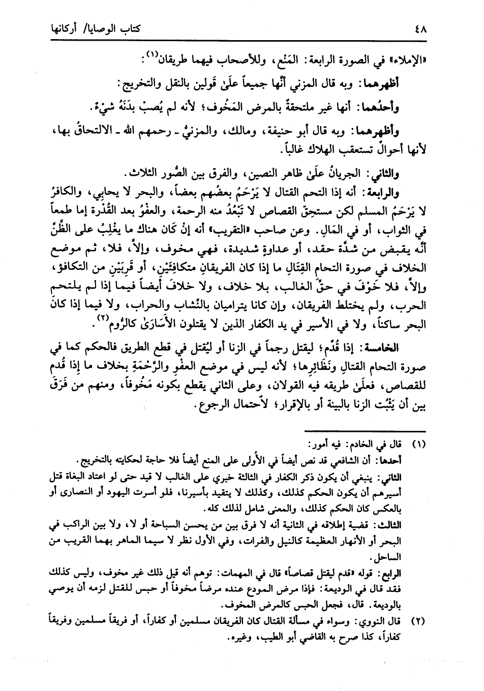 والرابعة: أنَّه إذا التحم القتال لا يَرْحَمُ بعضُهم بعضاً، والبحر لا يحابِي، والكافرُ لا يَرْحَمُ المسلم لكن مستحِقّ القصاص لا تَبْعُدُ منه الرحمة، والعفْوُ بعد القُدْرة إما طمعاً في الثواب، أو في المَالِ. وعن صاحب "التقريب" أنه إنْ كَان هناك ما يغْلِبُ على الظَّنَّ أنَّه يقبض من شدَّة حقد، أو عداوةٍ شديدة، فهي مخوف، وإلاَّ، فلا، ثم موضع الخلاف فيِ صورة التحامِ القِتَالِ ما إذا كان الفريقانِ متكافِئَيْن، أو قَرِبَيْنِ من التكافؤ، وإلاَّ، فلا خوْفَ في حقِّ الغالب، بلا خلاف، ولا خلافَ أَيضاً فيما إذا لم يلتحمِ الحرب، ولم يختلط الفريقان، وإن كانا يتراميان بالنِّشاب والحراب، ولا فيما إذا كان البحر ساكناً، ولا في الأسير في يد الكفار الدين لا يقتلون الأَسَارَى كالرُّوم (¬2).
