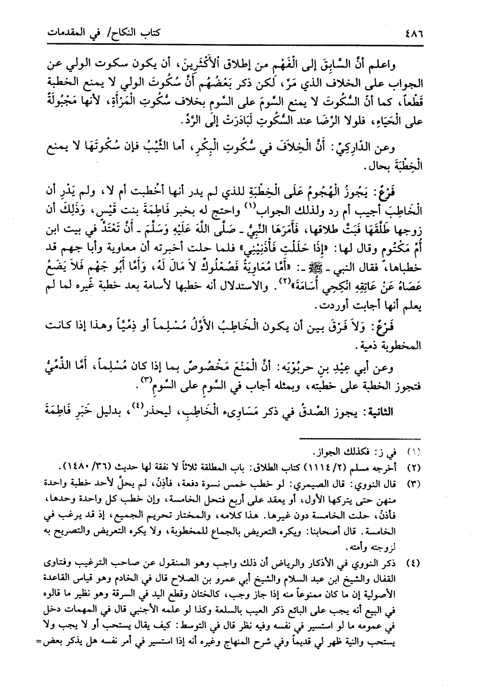 (¬3) قال النووي: قال الصيمري: لو خطب خمس نسوة دفعة، فأذِنّ، لم يحلَّ لأحد خطبة واحدة منهن حتى يتركها الأول، أو يعقد على أربع فتحل الخامسة، وإن خطب كل واحدة وحدها، فأذنّ، حلت الخامسة دون غيرها. هذا كلامه، والمختار تحريم الجميع، إذ قد يرغب في الخامسة. قال أصحابنا: ويكره التعريض بالجماع للمخطوبة، ولا يكره التعريض والتصريح به لزوجته وأمته.