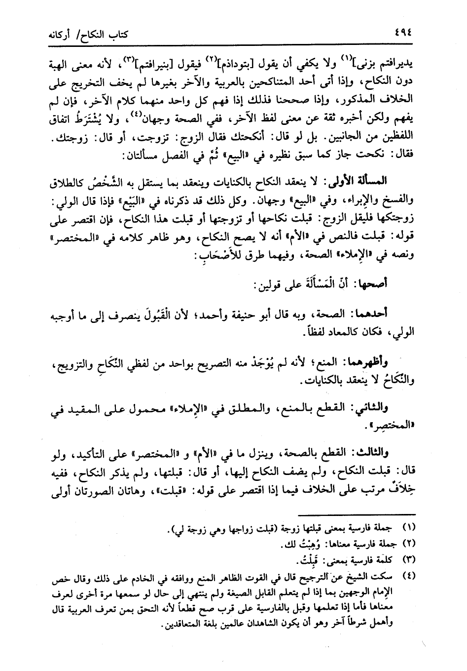 المسألة الأولى: لا ينعقد النكاح بالكنايات وينعقد بما يستقل به الشَّخْصُ كالطلاق والفسخ والإِبراء، وفي "البيع" وجهان. وكل ذلك قد ذكرناه في "البَيْع" فإذا قال الولي: زوجتكها فليقل الزوج: قبلت نكاحها أو تزوجتها أو قبلت هذا النكاح، فإن اقتصر على قوله: قبلت فالنص في "الأم" أنه لا يصح النكاح، وهو ظاهر كلامه في "المختصر" ونصه في "الإِملاء" الصحة، وفيهما طرق للأَصْحَابِ: