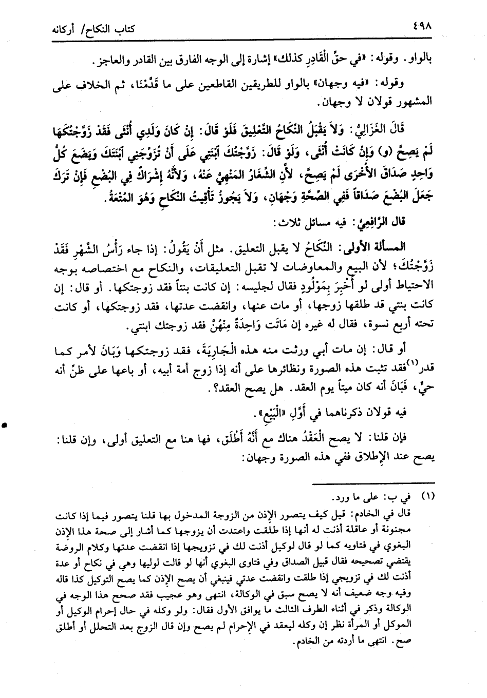 المسألة الأولى: النِّكَاحُ لا يقبل التعليق. مثل أَنْ يَقُولُ: إذا جاء رَأْسُ الشَّهْرِ فَقَدْ زَوَّجْتُكَ؛ لأن البيع والمعاوضات لا تقبل التعليقات، والنكاح مع اختصاصه بوجه الاحتياط أولى لو أخْبِرَ بِمَوْلُودٍ فقال لجليسه: إن كانت بنتاً فقد زوجتكها. أو قال: إن كانت بنتي قد طلقها زوجها، أو مات عنها، وانقضت عدتها، فقد زوجتكها، أو كانت تحته أربع نسوة، فقال له غيره إن مَاتَت وَاحِدَةٌ: مِنْهُنَّ فقد زوجتك ابنتي.