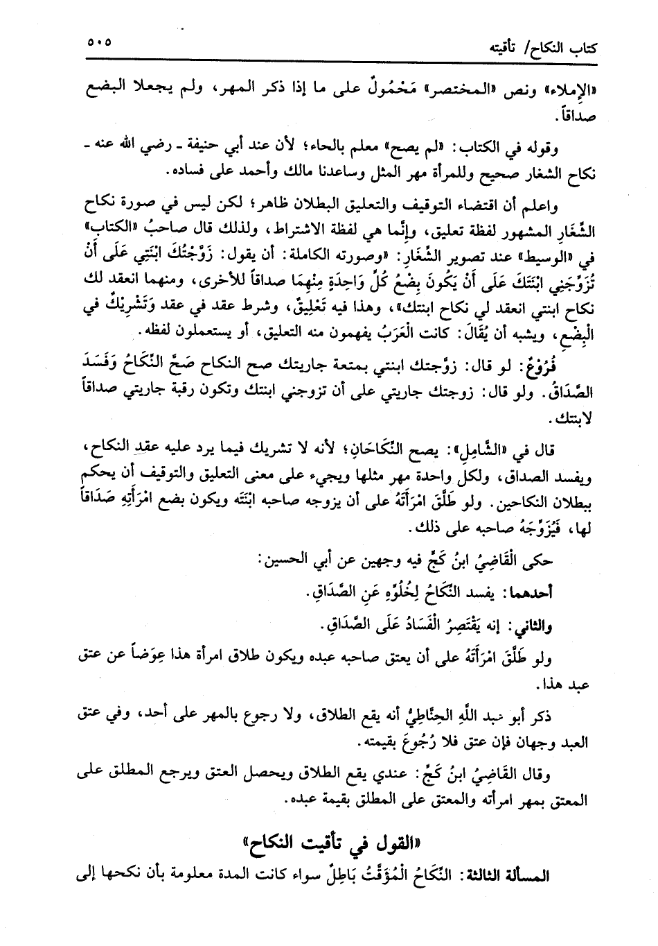واعلم أن اقتضاء التوقيف والتعليق البطلان ظاهر؛ لكن ليس في صورة نكاح الشِّغَارِ المشهور لفظة تعليق، وإنَّما هي لفظة الاشتراط، ولذلك قال صاحبُ "الكتاب" في "الوسيط" عند تصوير الشِّغَارِ: "وصورته الكاملة: أن يقول: زَوْجْتُكَ ابْنَتي عَلَى أَنْ تُزَوِّجَنِي ابْنَتَكَ عَلَى أَنْ يَكُونَ بِضْعُ كُلِّ وَاحِدَةٍ مِنْهِمَا صداقاً للأخرى، ومنهما انعقد لك نكاح ابنتي انعقد لي نكاح ابنتك"، وهذا فيه تَعْلِيقٌ، وشرط عقد في عقد وَتَشْرِيْكٌ في البِضْعِ، ويشبه أن يُقَالَ: كانت الْعَرَبُ يفهمون منه التعليق، أو يستعملون لفظه.