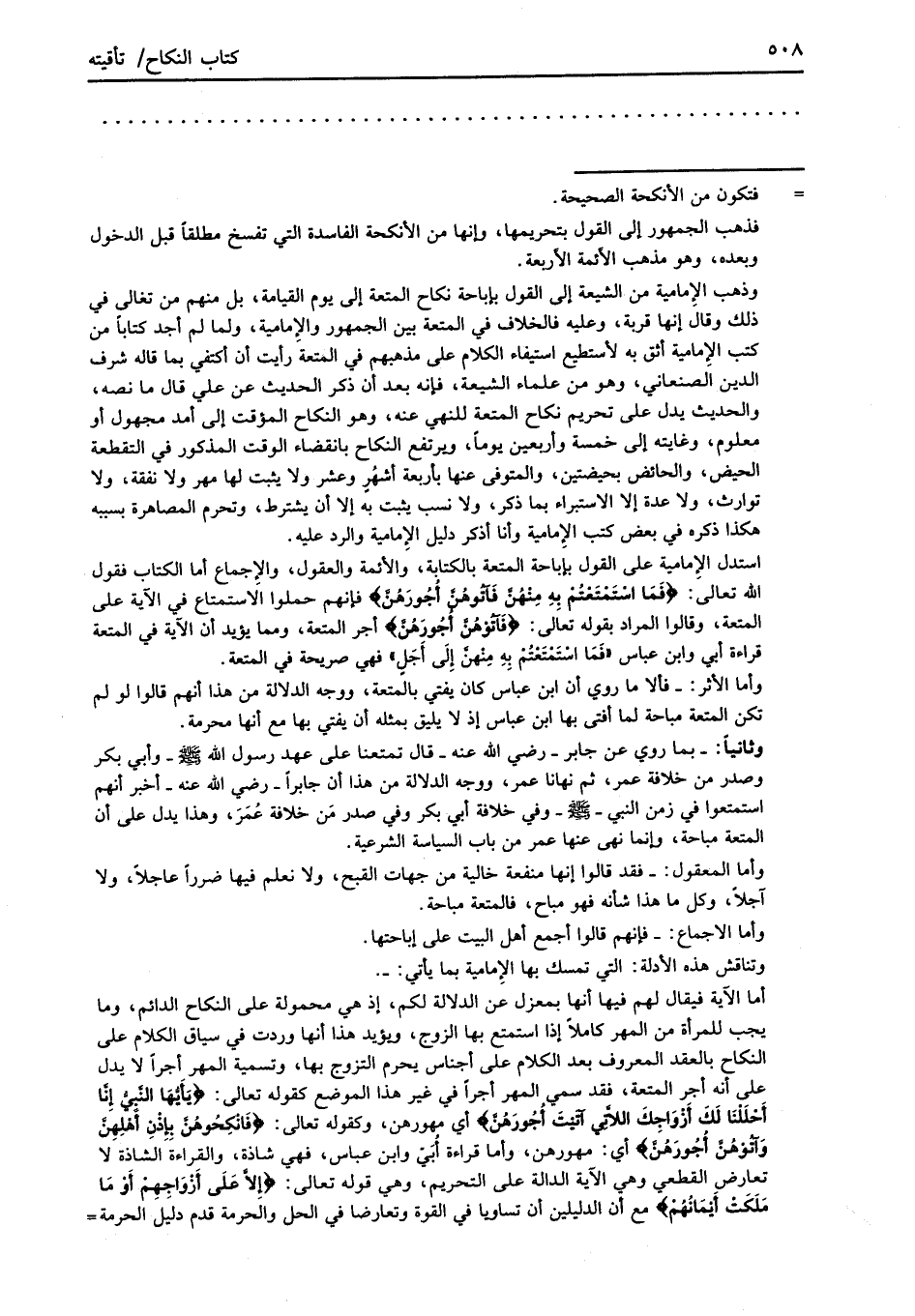 أما الآية فيقال لهم فيها أنها بمعزل عن الدلالة لكم، إذ هي محمولة على النكاح الدائم، وما يجب للمرأة من المهر كاملاً إذا استمتع بها الزوج، ويؤيد هذا أنها وردت في سياق الكلام على النكاح بالعقد المعروف بعد الكلام على أجناس يحرم التزوج بها، وتسمية المهر أجراً لا يدل على أنه أجر المتعة، فقد سمي المهر أجراً في غير هذا الموضع كقوله تعالى: {يَا أَيُّهَا النَّبِيُّ إِنَّا أَحْلَلْنَا لَكَ أَزْوَاجَكَ اللَّاتِي آتَيْتَ أُجُورَهُنَّ} أي مهورهن، وكقوله تعالى: {فَانْكِحُوهُنَّ بِإِذْنِ أَهْلِهِنَّ وَآتُوهُنَّ أُجُورَهُنَّ} أي: مهورهن، وأما قراءة أُبَيّ وابن عباس، فهي شاذة، والقراءة الشاذة لا تعارض القطعي وهي الآية الدالة على التحريم، وهي قوله تعالى: {إِلاَّ عَلَى أَزْوَاجِهِمْ أَوْ مَا مَلَكَتْ أَيْمَانُهُمْ} مع أن الدليلين أن تساويا في القوة وتعارضا في الحل والحرمة قدم دليل الحرمة =