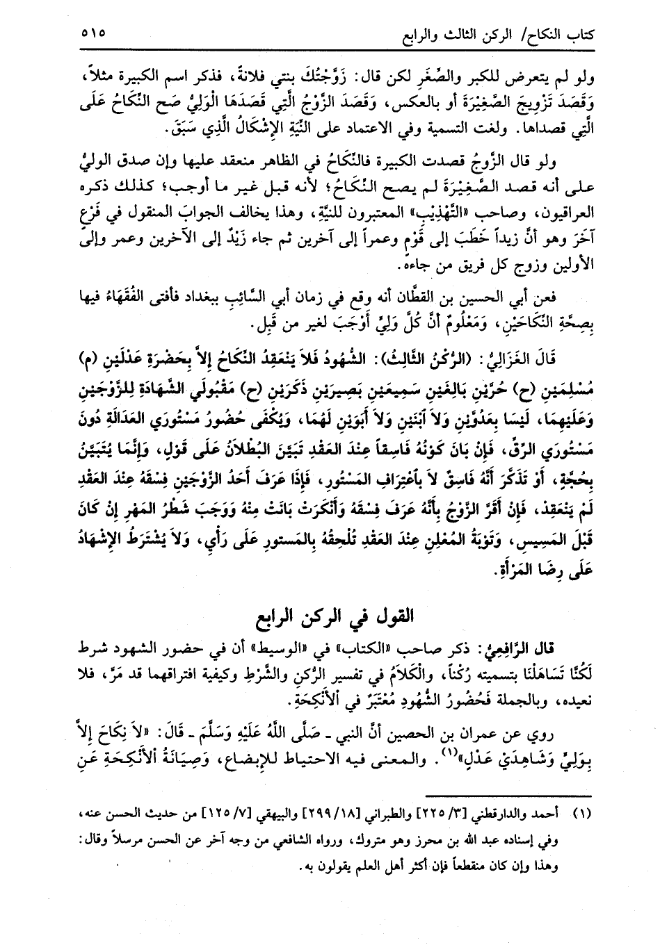 قال الرَّافِعِيُّ: ذكر صاحب "الكتاب" في "الوسيط" أن في حضور الشهود شرط لَكُنَّا تَسَاهَلْنَا بتسميته رُكْناً، والْكَلاَمُ في تفسير الرُّكنِ والشَّرْطِ وكيفية افتراقهما قد مَرَّ، فلا نعيده، وبالجملة فَحُضُورُ الشُّهُودِ مُعْتَبَرٌ في الأَنْكِحَةِ.