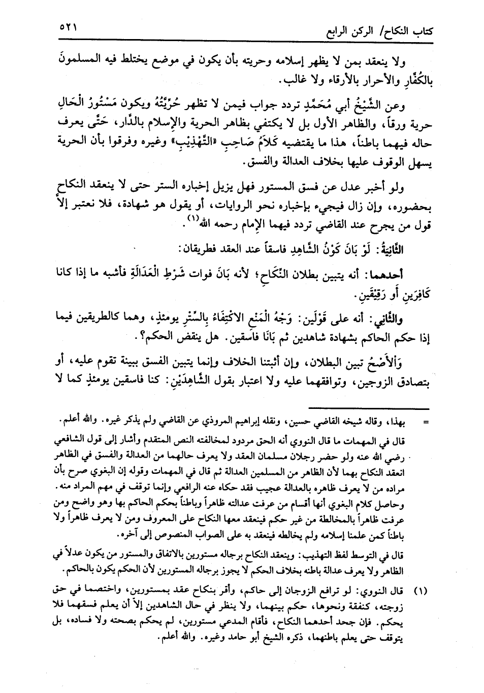 (¬1) قال النووي: لو ترافع الزوجان إلى حاكم، وأقر بنكاح عقد بمستورين، واختصما في حق زوجته، كنفقة ونحوها، حكم بينهما، ولا ينظر في حال الشاهدين إلاَّ أن يعلم فسقهما فلا يحكم. فإن جحد أحدهما النكاح، فأقام المدعي مستورين، لم يحكم بصحته ولا فساده، بل يتوقف حتى يعلم باطنهما، ذكره الشيخ أبو حامد وغيره. والله أعلم.