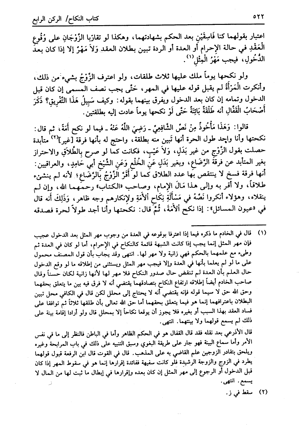 اعتبار بقولهما كنا فَاسِقَيْنِ بعد الحكم بشهادتهما، وهكذا لو تقارّبا الزَّوْجَانِ على وُقُوعِ الْعَقْدِ في حالة الإحرام أو العدة أو الردة تبين بطلان العقد وَلاَ مَهْرٌ إلا إذا كان بعد الدُّخُولِ، فيجب مَهْرُ الْمِثْلِ (¬1).