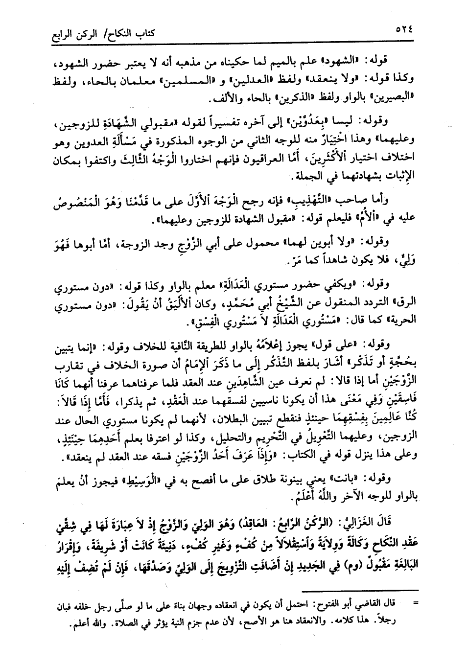 قَالَ الغَزَالِيُّ: (الرُّكْنُ الرَّابعُ: العَاقِدُ) وَهُوَ الوَلِيّ وَالزَّوْجُ إِذْ لاَ عِبَارَةَ لَهَا في شِقَّيْ عَقْدِ النِّكَاحِ وَكَالَةً وَوِلاَيَةً وَاسْتِقْلاَلاً من كُفْءٍ وَغَيْرِ كُفْءٍ، دَنِيئَةً كَانَتْ أَوْ شَرِيفَةً، وَإِقْرَارُ البَالِغَةِ مَقْبُولٌ (وم) في الجَدِيدِ إِنْ أَضَافَتِ التَّزْوِيجَ إلَى الوَلِيِّ وَصَدَّقَهَا، فَإِنْ لَمْ تُضِفْ إِلَيْهِ