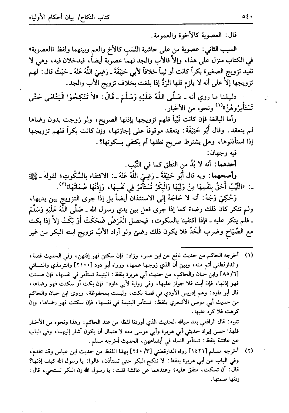 السبب الثاني: عصوبة من على حاشية النَّسَبِ كالأخ والعم وبينهما ولفظ "العصوبة" في الكتاب منزل على هذا، وإلاَّ فالأب والجد لهمَا عصوبة أيضاً، فيدخلان فيه، وهي لا تفيد تزويج الصغيرة بكراً كانت أو ثيباً خلافاً لأبي حَنِيْفَةَ -رَضِيَ اللهُ عَنْهُ- حَيْثُ قال: لهم تزويجها إلاَّ على أنه لا يلزم فلها الرَدُّ إذا بلغت بخلاف تزويج الأب والجد.