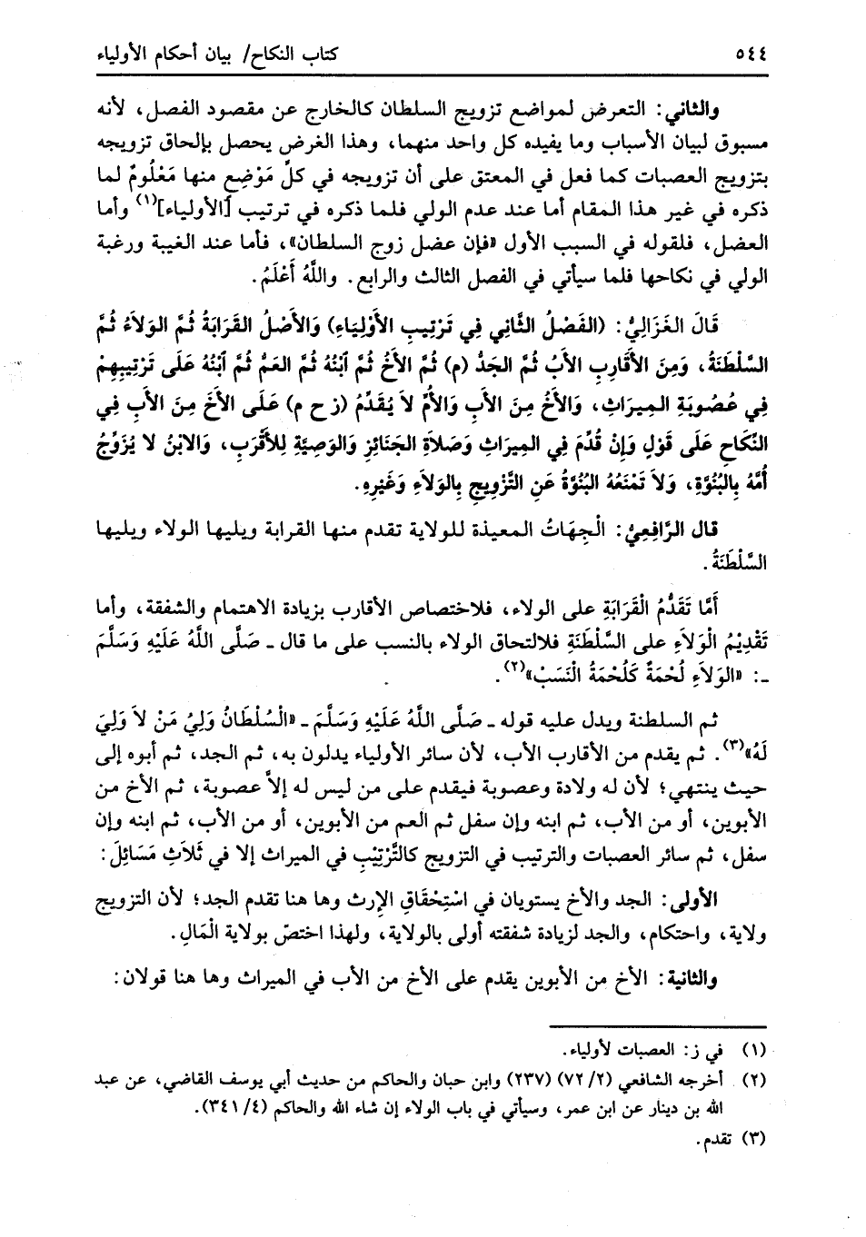 قَالَ الغَزَالِيُّ: (الفَصْلُ الثَّانِي في تَرْتيبِ الأَوْليَاءِ) وَالأَصْلُ القَرَابَةُ ثُمَّ الوَلاَءُ ثُمَّ السَّلْطَنَةُ، وَمِنَ الأَقَارِبِ الأَبُ ثُمَّ الجَدُّ (م) ثُمَّ الأَخُ ثُمَّ ابْنُهُ ثُمَّ العَمُّ ثُم ابْنُهُ عَلَى تَرْتِيبِهِمْ فِي عُصُوبَةِ المِيرَاثِ، وَالأَخُ مِنَ الأَبِ وَالأُمِّ لاَ يُقَدِّمُ (ز ح م) عَلَى الأَخَ مِنَ الأَبِ في النِّكَاحِ عَلَى قَوْلٍ وَإنْ قُدَّمَ في المِيرَاثِ وَصَلاَةِ الجَنَائِزِ وَالوَصِيَّةِ لِلأَقْرَبِ، وَالابْنُ لا يُزَوِّجُ أُمَّهُ بِالبُنُوَّةِ، وَلاَ تَمْنَعُهُ البُنُوَّةُ عَنِ التَّزْوِيجِ بِالوَلاَءِ وَغَيْرِهِ.