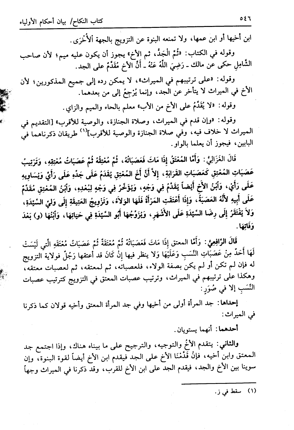 قَالَ الغَزَالِيُّ: وَأَمَّا المُعْتَقُ إِذَا مَاتَ فَعَصَبَاتُهُ، ثُمَّ مُعْتِقُهُ ثُمَّ عَصَبَاتُ مُعْتِقِهِ، وَتَرْتِيبُ عَصَبَاتِ المُعْتِقِ كَعَصَبَاتِ القَرَابَةِ، إِلاَّ أَنَّ أَخَ المُعْتِقِ يُقَدَم عَلَى جَدِّهِ عَلَى رَأَيٍّ وَيُسَاوِيهِ عَلَى رَأَيْ، وَابْنُ الأَخ أَيْضًا يُقَدَّمُ في وَجْه، وَيؤَخَّرُ في وَجْهٍ لِبُعْدِهِ، وَابْنُ المُعْتِقِ مُقَدَّمٌ عَلَى أَبِيهِ لأَنَّهُ العَصَبَةُ، وَإِذَا أَعْتَقَتِ المَرْأَة فَلَهَا الوَلاَءُ، وَتَزْوِيجُ العَتِيقَةِ إِلَى وَليِّ السَّيِّدَةِ، وَلاَ يُفْتَقَرُ إِلَى رِضَا السَّيِّدَةِ عَلَى الأَشْهَرِ، وَيُزَوِّجُهَا أبو السَّيِّدَةِ في حَيَاتِهَا، وَابْنُهَا (و) بَعْدَ وَفَاِتِها.