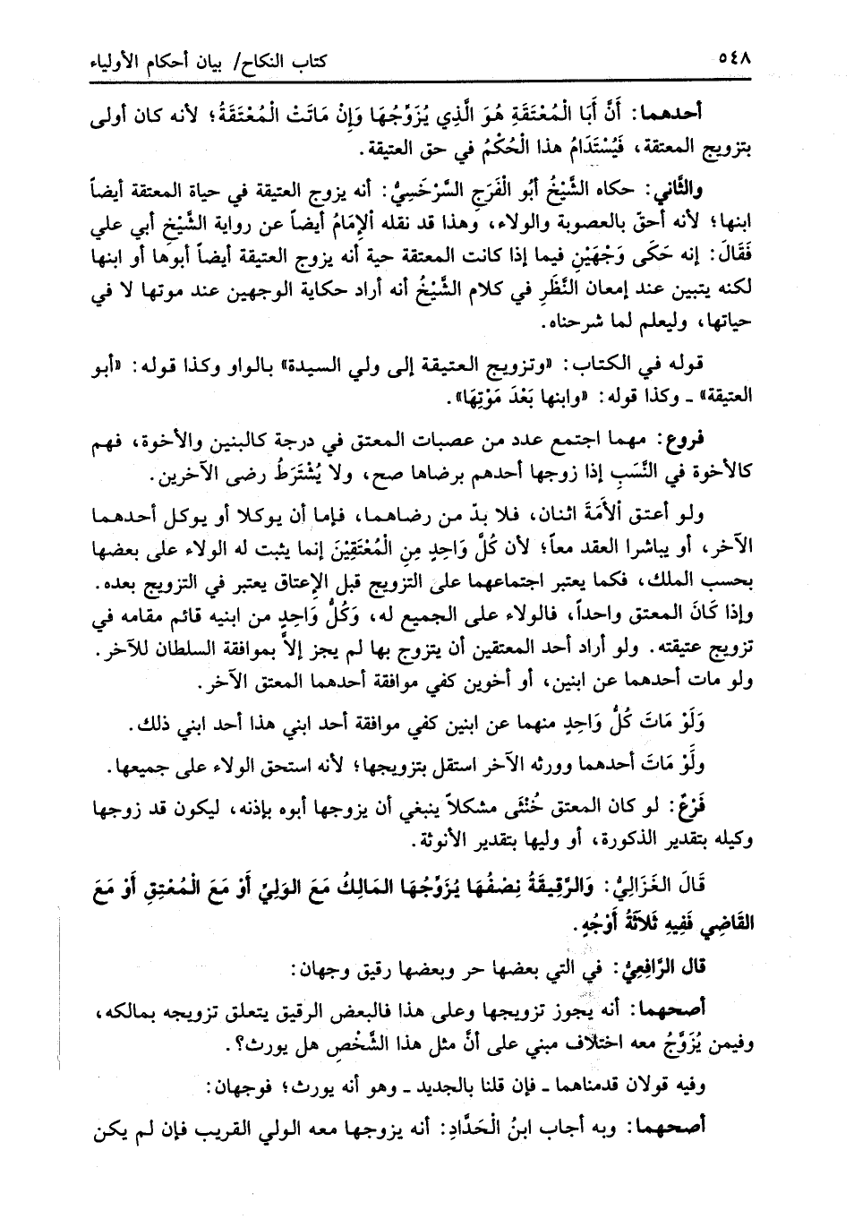 قَالَ الغَزَالِيُّ: وَالرَّقِيقَةُ نِصْفُهَا يُزُوِّجُهَا المَالِكُ مَعَ الوَليِّ أَوْ مَعَ الْمُعْتِقِ أَوْ مَعَ القَاضِي فَفِيهِ ثَلاَثةُ أَوْجُهٍ.