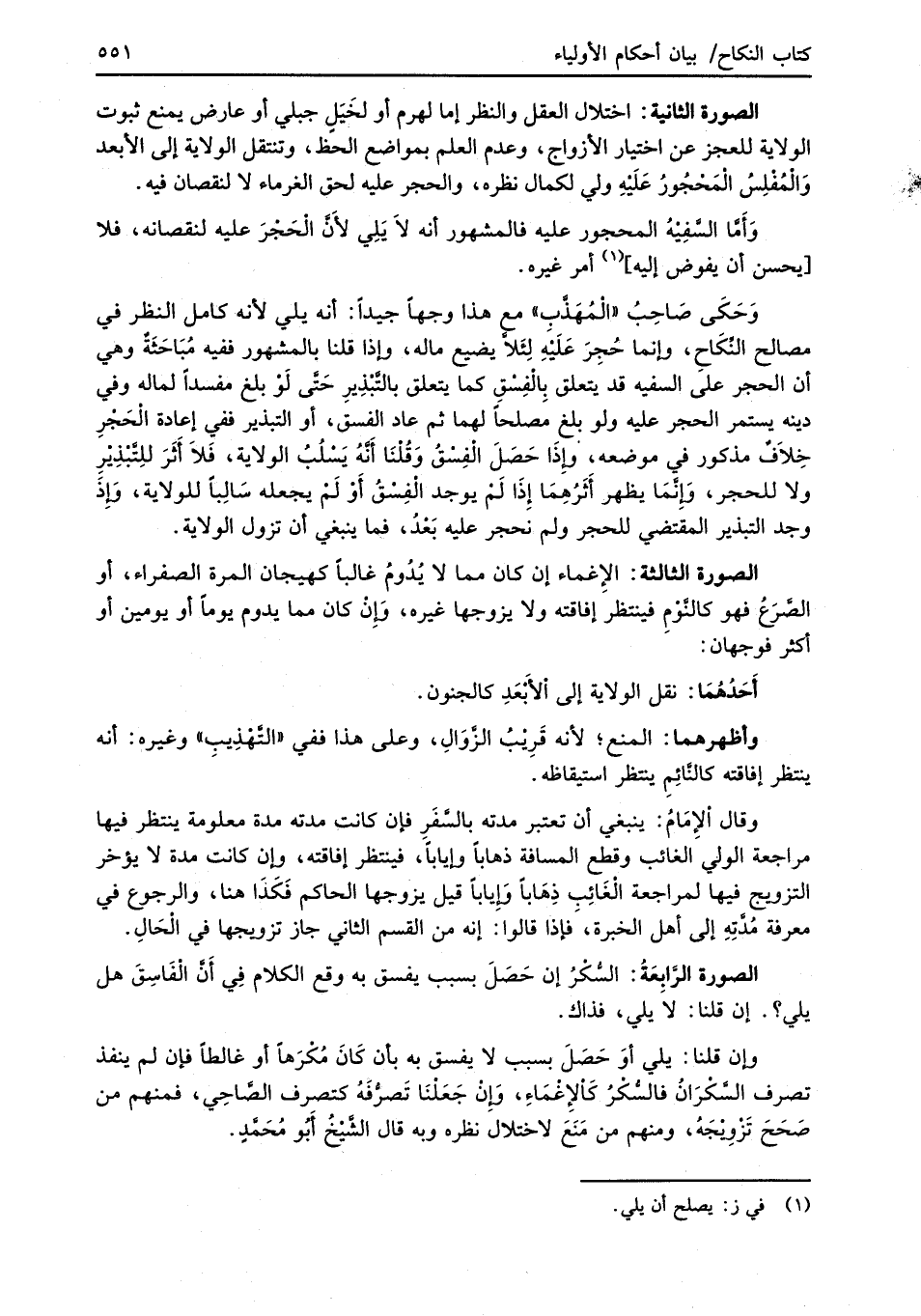 الصورة الثانية: اختلال العقل والنظر إما لهرم أو لخَيَلٍ جبلي أو عارض يمنع ثبوت الولاية للعجز عن اختيار الأزواج، وعدم العلم بمواضع الحظ، وتنتقل الولاية إلى الأبعد وَالمُفْلِسُ الْمَحْجُورُ عَلَيْهِ ولي لكمال نظره، والحجر عليه لحق الغرماء لا لنقصان فيه.