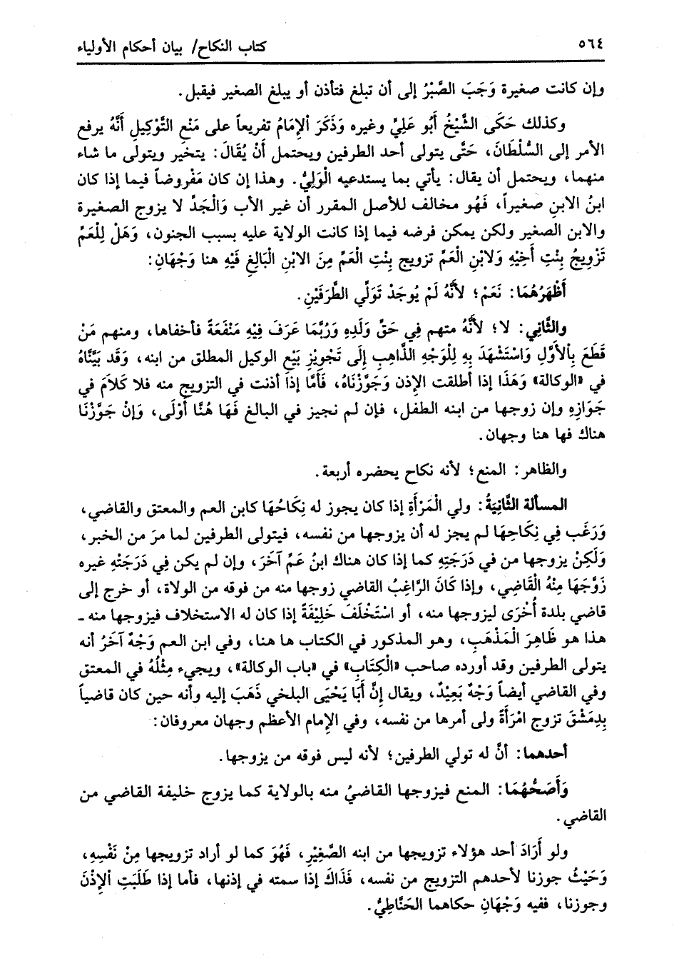 وكذلك حَكَى الشَّيْخُ أَبُو عَلِيٍّ وغيره وَذَكَرَ الإِمَامُ تفريعًا على مَنْعِ التَّوْكِيلِ أَنَّهُ يرفع الأمر إلى السُّلْطَانَ، حَتَّى يتولى أحد الطرفين ويحتمل أَنْ يُقَالَ: يتخير ويتولى ما شاء منهما، ويحتمل أن يقال: يأتي بما يستدعيه الْوَلِيُّ. وهذا إن كان مَفْروضًا فيما إذا كان ابنُ الابنِ صغيرًا، فَهُو مخالف للأصل المقرر أن غير الأب وَالْجَدِّ لا يزوج الصغيرة والابن الصغير ولكن يمكن فرضه فيما إذا كانت الولاية عليه بسبب الجنون، وَهَلْ لِلْعَمِّ تَزْوِيجُ بِنْتِ أَخِيْهِ وَلابْنِ الْعَمِّ تزويج بِنْتِ الْعَمِّ مِنَ الابْنِ الْبَالِغِ فَيْهِ هنا وَجْهَانِ: