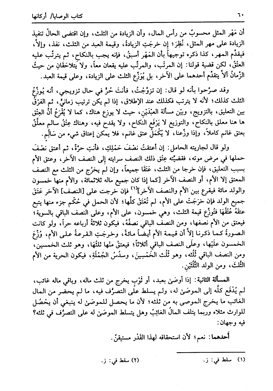 المسألة الثانية: إذا أوصَى بعبد، أو ثَوْبٍ يخرج من ثلث ماله، وباقي ماله غائب، لم يُدْفَع كلُّه إلى الموصَى له، ولم يسلط على التصرُّف فيه، ما لم يحضر من المال الغائب ما يخرج الموصى به من ثلثه؛ لأن ما يحصل للموصَى له ينبغي أن يحْصُل للوارث مثلاه وربما يتلف المالُ الغائِبُ وهل يتسلط الموصَى له على التصرُّف في ثلثه؟ فيه وجهان: