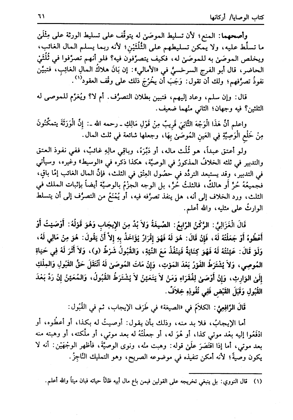 قَالَ الْغَزَالِيُّ: الرُّكْنُ الرَّابعُ: الصِّيغَةُ وَلاَ بُدَّ مِنَ الإِيجَابِ وَهُوَ قَوْلُهُ: أَوْصَيْتُ أَوْ أَعْطُوهُ أَوْ جَعَلْتُهُ لَهُ، فَإنْ قَالَ: هُوَ لَهُ فَهُوَ إِقْرَارٌ يُؤَاخَذُ بِهِ إِلاَّ أَنْ يَقُولَ: هُوَ مِنْ مَالي لَهُ، وَلَوْ قَالَ: عَيَّنْتُهُ لَهُ فَهُوَ كِنَايَةٌ فَيَنْفذُ مَعَ النِّيَّةِ، وَالقُبُولُ شَرْطٌ (و)، وَلاَ أَثَرَ لَهُ في حَيَاةِ المُوصِي، وَلاَ يُشْتَرَط الفَوْرُ بَعْدَ المَوْتِ، وَإنْ مَاتَ المُوصَى لَه انْتَقَلَ حَقُّ القَبُولِ وَالمِلْكِ إلى الوَارِثِ، وَإِنْ أَوْصَى لِفُقَرَاءِ وَمَنْ لاَ يَتَعَيَّنُ لاَ يُشْتَرَطُ القُبُولُ، وَالمُعَيَّنُ إِنْ رَدَّ بَعْدَ القُبُولِ وَقَبَلَ القَبْضِ فَفِي نُفُوذِهِ خِلاَفٌ.