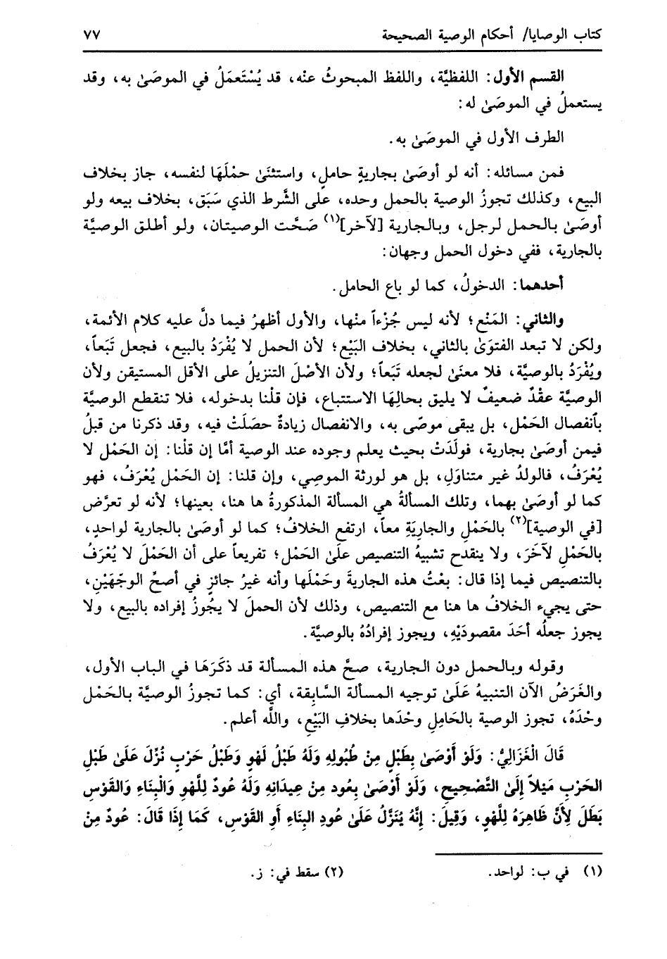 والثاني: المَنْع؛ لأنه ليس جُزْءًا منْها، والأول أظهرُ فيما دلَّ عليه كلام الأئمة، ولكن لا تبعد الفتوَى بالثاني، بخلاف البَيْع؛ لأن الحمل لا يُفْرَدُ بالبيع، فجعل تَبَعًا، وُيفْرَدُ بالوصيَّة، فلا معنَى لجعله تَبَعًا؛ ولأن الأصْلَ التنزيلُ على الأقل المستيقن ولأن الوصيَّة عقْدٌ ضعيفٌ لا يليق بحالِهَا الاستتباع، فإن قلْنا بدخوله، فلا تنقطع الوصيَّة بانفصال الحَمْل، بل يبقى موصى به، والانفصال زيادة حصَلَتْ فيه، وقد ذكرنا من قبلُ فيمن أوصَى بجارية، فولَدَتْ بحيث يعلم وجوده عند الوصية أمَّا إن قلْنا: إن الحَمْل لا يُعْرَفُ، فالولدُ غير متناوَلِ، بل هو لورثة الموصِي، وإن قلنا: إن الحَمْل يُعْرَفُ، فهو كما لو أوصَى بهما، وتلك المسألةُ هي المسألة المذكورةُ هاهنا، بعينها؛ لأنه لو تعرَّض [في الوصية] (¬2) بالحَمْلِ والجارَيةِ معاً، ارتفع الخلافُ؛ كما لو أوصَى بالجارية لواحدٍ، بالحَمْلِ لآخَرَ، ولا ينقدح تشبيهُ التنصيص عَلَى الحَمْل؛ تفريعًا على أن الحَمْلَ لا يُعْرَفُ بالتنصيص فيما إذا قال: بعْتُ هذه الجاريةَ وحَمْلَها وأنه غيرُ جائز في أصحِّ الوجْهَيْنِ، حتى يجيء الخلافُ هاهنا مع التنصيص، وذلك لأن الحملَ لا يجُوزُ إفراده بالبيع، ولا يجوز جعلُه أحَدَ مقصودَيْهِ، ويجوز إفرادُهُ بالوصيَّة.