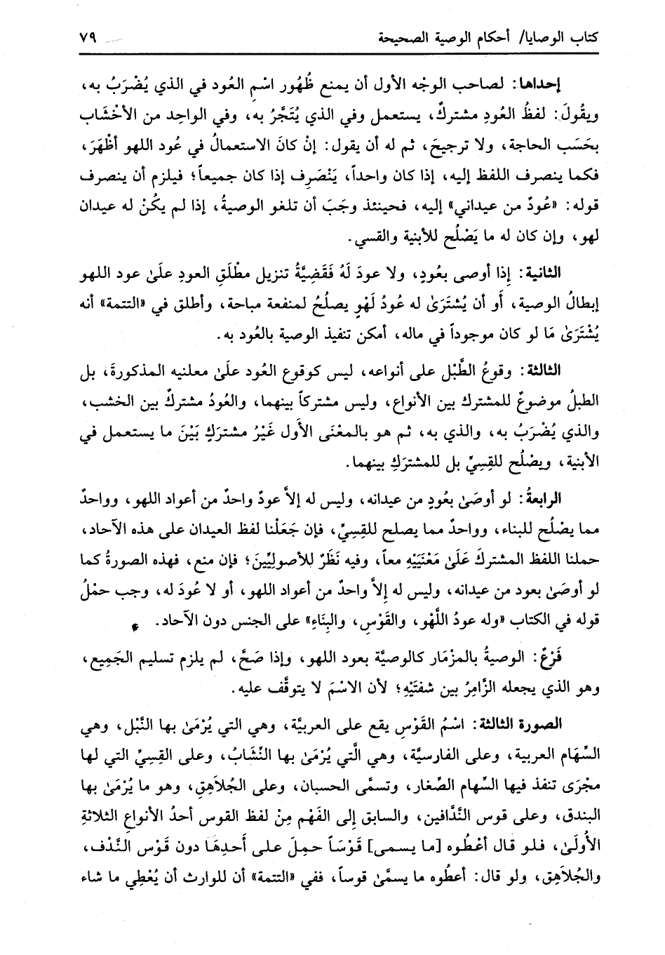 الصورة الثالثة: اسْمُ القَوْسِ يقع على العربيَّة، وهي التي يُرْمَى بها النَّبْل، وهي السِّهَام العربية، وعلى الفارسيَّة، وهي الَّتي يُرْمَى بها النِّشَابُ، وعلى القِسِيِّ التي لها مجْرَى تنفذ فيها السِّهام الصِّغار، وتسمَّى الحسبان، وعلى الجُلاَهِقِ، وهو ما يُرْمَى بها البندق، وعلى قوس النَّدَّافين، والسابق إِلى الفَهْم من لفظ القوس أحدُ الأنواعِ الثلاثةِ الأُولَى، فلو قال أعْطُوه [ما يسمى] قَوْسَاً حمِلَ على أَحدِهَا دون قَوْس النَّدْف، والجُلاَهِق، ولو قال: أعطُوه ما يسمَّى قوساً، ففي "التتمة" أن للوارث أن يُعْطِي ما شاء
