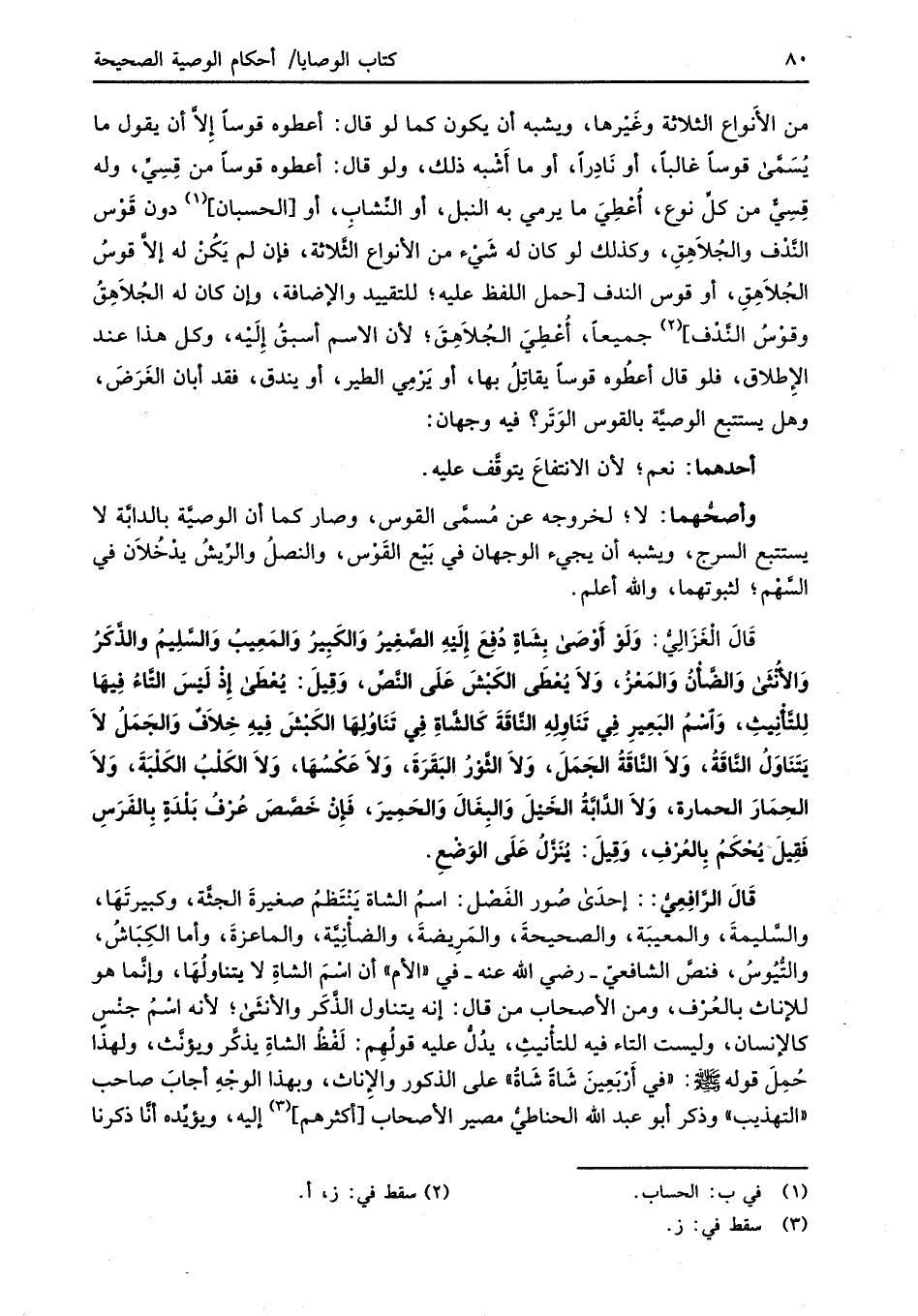 قَالَ الْغَزَالِيُّ: وَلَوْ أَوْصَى بِشَاةٍ دُفِعَ اِلَيْهِ الصَّغِيرُ وَالكبِيرُ وَالمَعِيبُ وَالسَّلِيمُ والذَّكَرُ وَالأُنْثَى وَالضَّأْنُ وَالمَعْزُ، وَلاَ يُعْطَى الكَبْشَ عَلَى النَّصِّ، وَقِيلَ: يُعْطَى إِذْ لَيْسَ التَّاءُ فِيهَا لِلتَّأْنِيثِ، وَاسْمُ البَعِيرِ في تَنَاوِلِهِ النَّاقَةَ كَالشَّاةِ في تَنَاوُلهَا الكَبْشَ فِيهِ خِلاَفٌ وَالجَمَلُ لاَ يَتَنَاوَلُ النَّاقَةُ، وَلاَ النَّاقَةُ الجَمَلَ، وَلاَ الثَّوْرُ البَقَرَةَ، وَلاَ عَكْسُهَا، وَلاَ الكَلْبُ الكَلْبَةَ، وَلاَ الحِمَارَ الحمارة، وَلاَ الدَّابَّةُ الخَيْلَ وَالبِغَالَ وَالحَمِيرَ، فَإِنْ خَصَّصَ عُرْفُ بَلْدَةٍ بِالفَرَسِ فَقِيلَ يُحْكَمُ بِالعُرْفِ، وَقِيلَ: يُنَزَّلُ عَلَى الوَضْعِ.