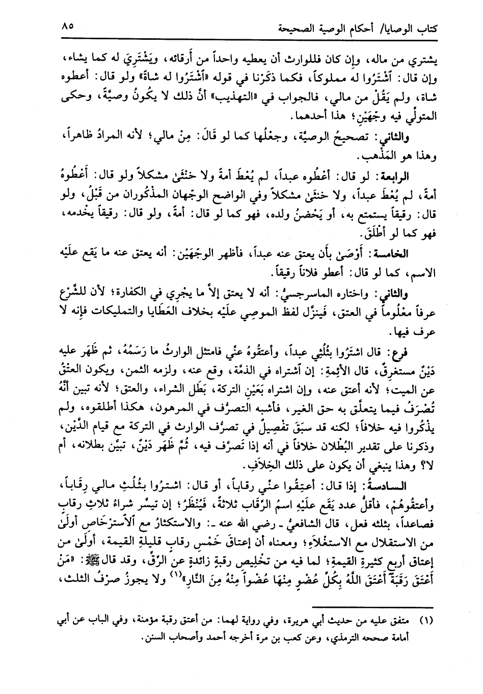السادسةُ: إذا قال: أعتِقُوا عنِّي رقابًا، أو قال: اشترُوا بثُلُثِ مالي رِقَابًا، وأعتقُوهُمْ، فأقلُّ عدد يَقَع علَيْهِ اسمُ الرِّقَاب ثلاثةٌ، فَيُنْظَرُ؛ إن تيسَّر شراءُ ثلاثِ رقابٍ فصاعدًا، بثلثه فعل، قال الشَّافعيُّ -رضي الله عنه-: والاستكثارُ مع الاسترْخَاص أولَى من الاستقلال مع الاستغْلاَءِ؛ ومعناه أن إعتاقَ خَمْسِ رقاب قليلةِ القيمة، أولَى من إعتاق أربعِ كثيرةِ القيمةِ؛ لما فيه من تخْلِيصِ رقبةٍ زائدةٍ عنَ الرِّقِّ، وقد قال -صلى الله عليه وسلم- "مَنْ أَعْتَقَ رَقَبَة أَعْتَقَ اللهُ بِكُل عُضْوٍ مِنْهَا عُضْواً مِنْهُ مِنَ النَّارِ" (¬1) ولا يجوزُ صرْفُ الثلث،