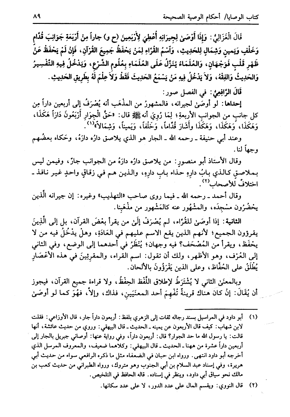 قَالَ الْغَزَالِيُّ: وَإِذَا أَوْصَى لِجِيرَانِهِ أُعْطِيَ لِأَرْبَعِينَ (ح و) جاراً مِنْ أَرْبَعَةِ جَوَانِبَ قُدَّامٍ وَخَلْفٍ وَيَمينٍ وَشِمَالٍ لِلحَدِيثِ، وَاسْمُ القُرَّاءِ لِمَنْ يَحْفَظُ جَمِيعَ القُرْآنِ، فَإنْ لَمْ يَحْفَظْ عَنْ ظَهْرِ قَلْبٍ فَوَجْهَانٍ، وَالعُلَمَاءُ يُنَزَّلُ عَلَى العُلَمَاءِ بِعُلُومِ الشَّرْعِ، وَيَدْخُلُ فِيهِ التَّفْسِيرُ وَالحَدِيثُ وَالفِقْهُ، وَلاَ يَدْخُلُ فِيهِ مَنْ يَسْمَعُ الحَدِيثَ فَقَطْ وَلاَ عِلْمَ لَهُ بِطَرِيقِ الحَدِيثِ.
