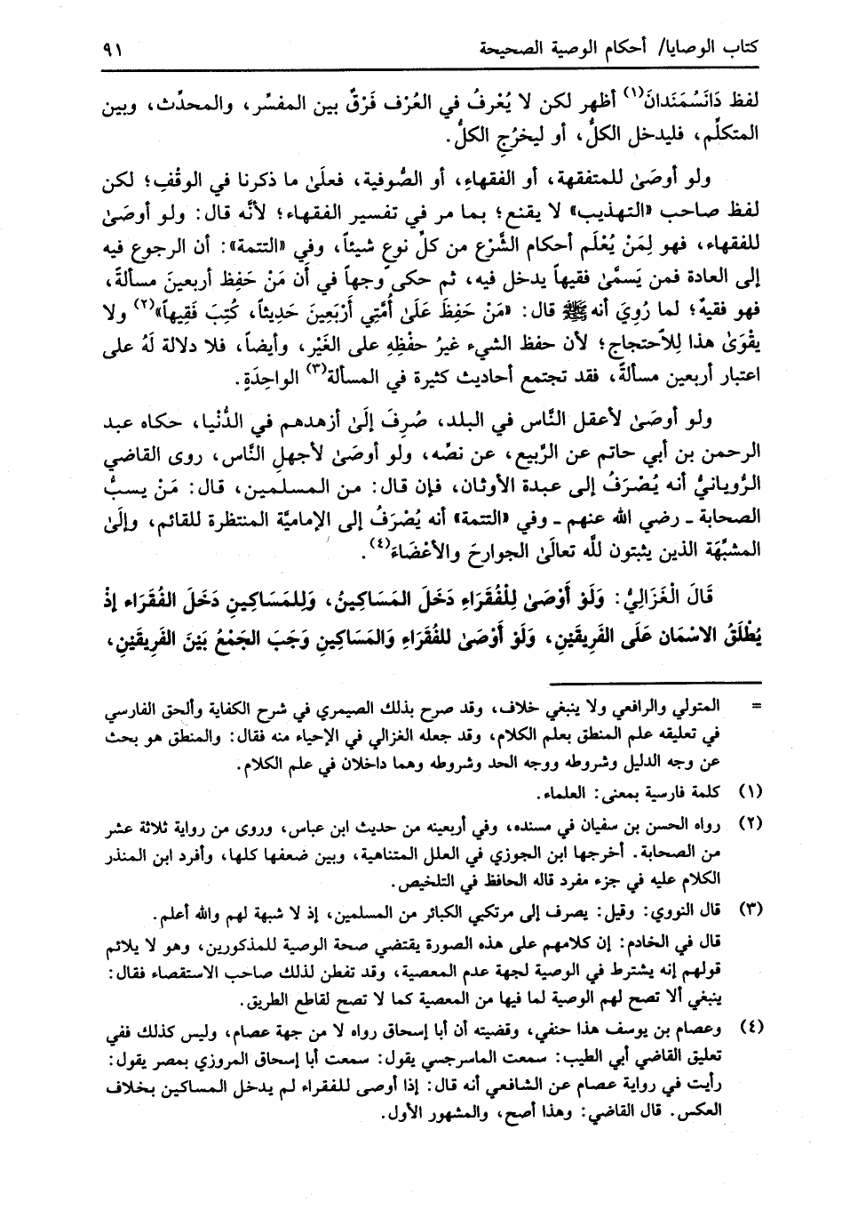 ولو أوصَى للمتفقهة، أو الفقهاءِ, أو الصُّوفية، فعلَى ما ذكرنا في الوقْفِ؛ لكن لفظ صاحب "التهذيب" لا يقنع؛ بما مر في تفسير الفقهاء؛ لأنَّه قال: ولو أوصَى للفقهاء، فهو لِمَنْ يُعْلَم أحكام الشَّرْع من كلِّ نوعٍ شيئاً، وفي "التتمة": أن الرجوع فيه إلى العادة فمن يُسمَّى فقيهاً يدخل فيه، ثم حكى وجهاً في أَن مَنْ حَفِظ أربعينَ مسألةً، فهو فقيهٌ؛ لما رُوِيَ أنه -صلى الله عليه وسلم- قال: "مَنْ حَفِظ عَلَى أُمَّتِي أَرْبَعِينَ حَدِيثاً، كُتِبَ فَقِيها" (¬2) ولا يقْوَى هذا لِلاحتجاج؛ لأن حفظ الشيء غيرُ حفْظِهِ على الغَيْر، وأيضاً، فلا دلالة لَهُ على اعتبار أربعين مسألةً، فقد تجتمع أحاديث كثيرة في المسألة (¬3) الواحِدَةِ.