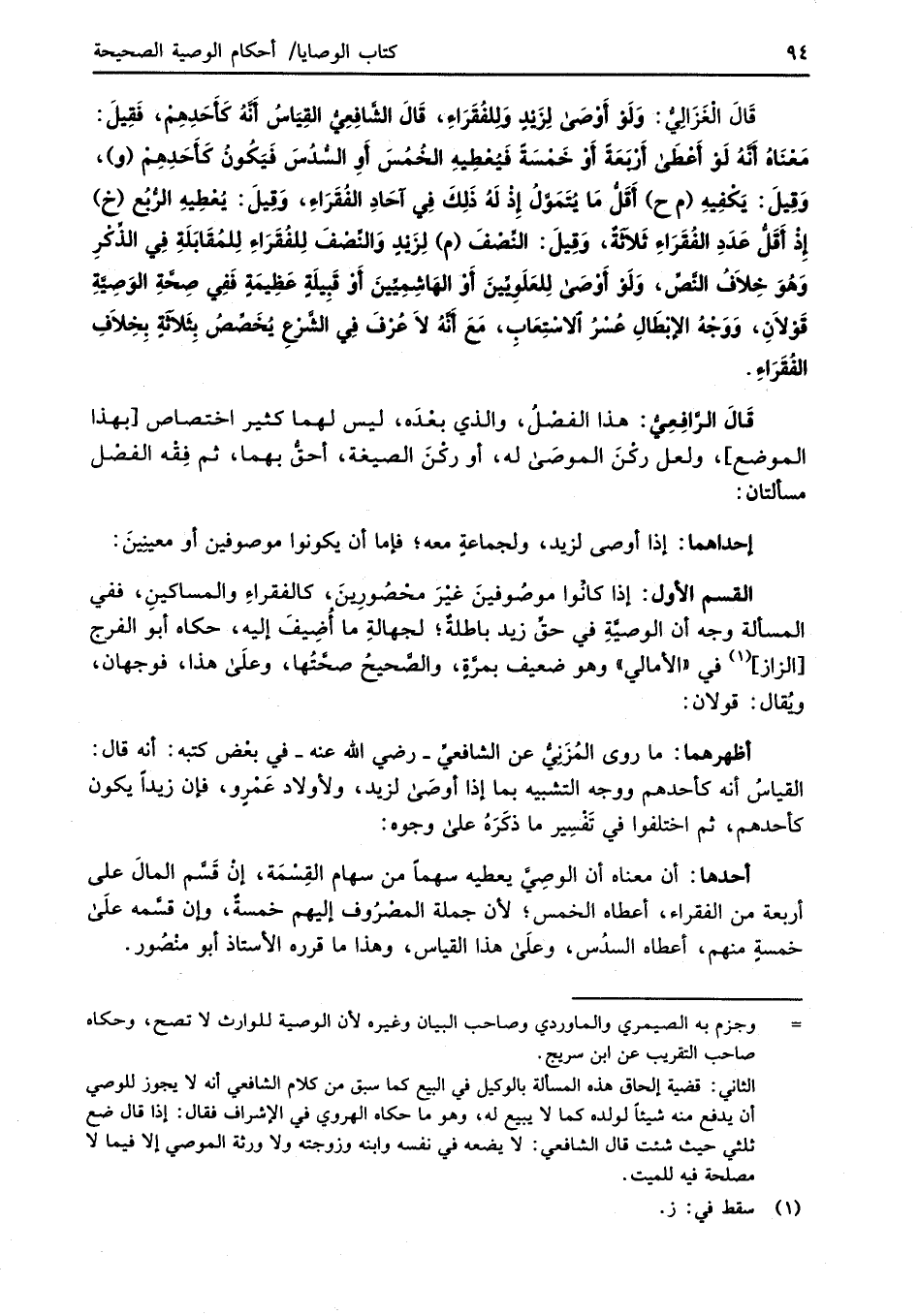 القسم الأول: إذا كانُوا موصُوفينَ غيْرَ محْصُورِينَ، كالفقراءِ والمساكينِ، ففي المسألة وجه أن الوصيَّةِ في حقِّ زيد باطلةٌ؛ لجهالةِ ما أُضِيفَ إليه، حكاه أبو الفرج [الزاز] (¬1) في "الأمالي" وهو ضعيف بمرَّةٍ، والصَّحيحُ صحَّتُها، وعلَى هذا، فوجهان، وُيقال: قولان: