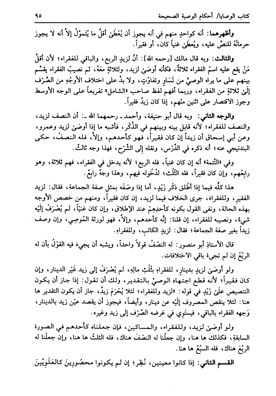 والثالث: وبه قال مالك [رحمه الله]: أنَّ لزيدٍ الربع، والباقي للفقراء؛ لأن أقلَّ مَنْ يقع عليه اسمُ الفقراء ثلاثةٌ، فكأنه أوصَى لزيد، ولثلاثةٍ معَهُ، ثم نصيبُ الفقراء يقسَّم بينهم على ما يراه الوصىُّ من تَسَاوٍ وتفاوُتٍ، ولا بدَّ على اختلاف الأوجُهِ من الصَّرْف إلَى ثلاثةٍ من الفقراء، وربما أفهم لفظ صاحب "الشامل" تفريعاً على الوجه الأوسط وجوز الاقتصار على اثنين منْهم، إذا كان زيدٌ فقيراً.