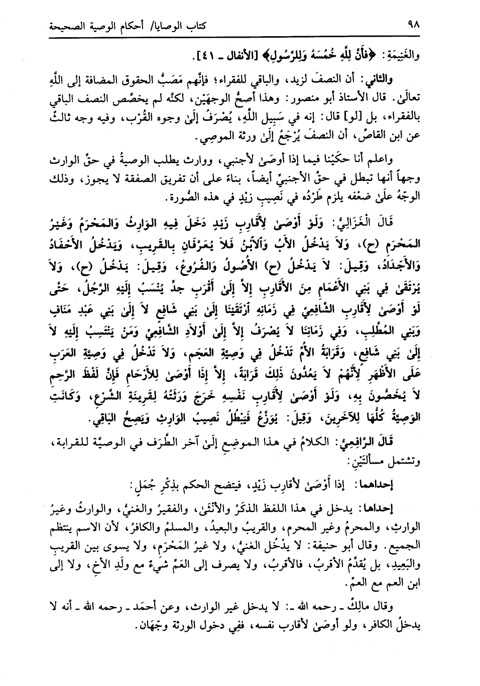 قَالَ الْغَزَالِيُّ: وَلَوْ أَوْصَى لِأَقَارِبِ زَيْدٍ دَخَلَ فِيهِ الوَارِثُ وَالمَحْرَمُ وَغَيْرُ المَحْرَمِ (ح)، وَلاَ يَدْخُلُ الأَبُ وَالابْنُ فَلاَ يُعَرَّفَانِ بِالقَرِيبِ، وَيدْخُلُ الأَحْفَادُ وَالأَجْدَادُ، وَقِيلَ: لاَ يَدْخُلُ (ح) الأُصُولُ وَالفُرُوعُ، وَقِيلَ: يَدْخُلُ (ح)، وَلاَ يُرْتَقَى فِي بَنِي الأَعْمَامِ مِنَ الأَقَارِبِ إِلاَّ إلى أَقْرَبِ جدٍّ يُنْسَبُ إِلَيْهِ الرَّجُلُ، حَتَّى لَوْ أَوْصَى لِأَقَارِبِ الشَّافِعِيِّ في زَمَانِهِ ارْتَقَيْنَا إلى بَنِي شَافِع لاَ إلى بَنِي عَبْدِ مَنَافٍ وَبَنِي المُطَّلِبِ، وَفِي زَمَانِنَا لاَ يُصرَفُ إِلاَّ إِلَى أَوْلاَدِ الشَّافِعِيِّ وَمَنْ يَنْتَسِبُ إِلَيْهِ لاَ إِلَى بَنِي شَافِعٍ، وَقَرَابَةُ الأُمِّ تَدْخُلُ فِي وَصِيَّةِ العَجَم، وَلاَ تَدْخُلُ في وَصِيَّةِ العَرَبِ عَلَى الأَظْهَرِ لِأَنَّهُمْ لاَ يَعُدُّونَ ذَلِكَ قَرَابَةً، إِلاَّ إِذَا أَوْصَى لِلأَرْحَامِ فَإِنَّ لَفْظَ الرَّحِمِ لاَ يُخَصُّونَ بِهِ، وَلَوْ أَوْصَي لِأَقَارِبِ نَفْسِهِ خَرَجَ وَرَثَتُهُ لِقَرِينَةِ الشَّرْعِ، وَكَانَتِ الوَصِيَّةُ كُلُّهَا لِلآخَرِينَ، وَقِيلَ: يُوَزَّعُ فَيَبْطُلُ نَصِيبُ الوَارِثِ وَيَصِحُّ البَاقِي.