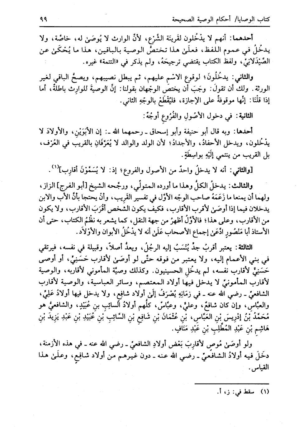 الثالثة: يعتبر أقربُ جدٍّ يُنْسَبُ إليه الرجُلُ، ويعدُّ أصلاً، وقبيلة في نفسه، فيرتقي في بني الأعمام إليه، ولا يعتبر من فوقه حتَّى لو أوصَى لأقارب حَسَنِيٍّ، أو أوصى حَسَنِيٌّ لأقارب نفسه، لم يدخُلِ الحسينيون. وكذلك وصيَّة المأموني لأقاربه، والوصية لأقارب المأمونيِّ لا يدخل فيها أولاد المعتصم، وسائر العباسية، والوصية لأقارب الشافعيِّ -رضي الله عنه- في زمَانِهِ يُصْرَفُ إلَى أولاد شافِعٍ، ولا يدخل فيها أولادُ عَلِيٍّ، والعبَّاسِ، وإن كان شافعٌ, وعليٌّ، وعبَّاسٌ، كلُّهم أولادُ السائِبِ بنِ عُبَيْدِ، والشافعيُّ هو مُحَمَّدُ بْنُ إدْرِيسَ بْنِ العَبَّاسِ، بْنِ عُثْمَانَ بْنِ شَافِعِ بْنِ السَّائِبِ بْنِ عُبَيْدِ بْنِ عَبْدِ يَزِيدَ بْنِ هَاشِمِ بْنِ عَبْدِ المُطَّلِبِ بْنِ عَبْدِ مَنَافٍ.