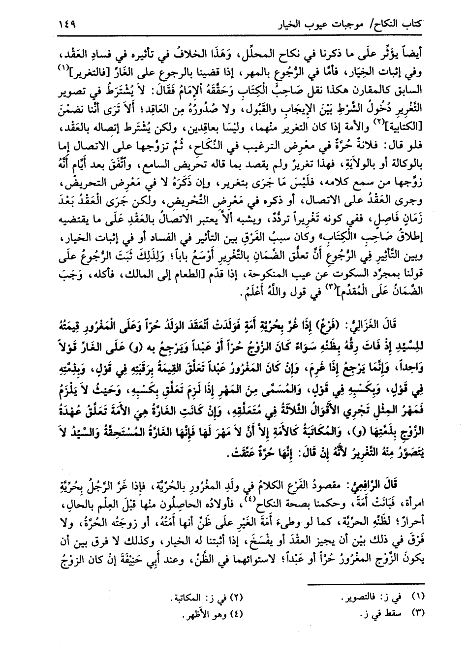 قَالَ الغَزَالِيُّ: (فَرْعٌ) إِذَا غُرَّ بِحُرِّيةِ أَمَةٍ فَوَلَدَتْ انْعَقَدَ الوَلَدُ حُرّاً وَعَلَى الْمَغْرُورِ قِيمَتُهُ للِسَّيِّدِ إِذْ فَاتَ رِقُّهُ بِظَنِّهِ سَوَاءٌ كَانَ الزَّوْجُ حُرّاً أَوْ عَبْداً وَيرْجِعُ به (و) عَلَى الغَارِّ قَوْلاً وَاحِداً، وَإنَّمَا يَرْجِعُ إِذَا غَرِمَ، وَإِنْ كَانَ المَغْرُورُ عَبْداً تَعَلَّقَ القِيمَة بِرَقَبَتِهِ فِي قَوْلٍ، وَبِذِمَّتِهِ في قَوْلٍ، وَبِكَسْبِهِ في قَوْلٍ، وَالمُسَمَّى مِنَ المَهْرِ إِذَا لَزِمَ تَعَلَّقِ بِكَسْبِهِ، وَحَيْثُ لاَ يَلْزَمُ فَمَهْرُ المِثْلِ تَجْرِي الأَقْوَالُ الثَّلاَثةُ فِي مُتَعَلَّقِهِ، وَإِنْ كَانَتِ الغَارَّةُ هِيَ الأَمَةَ تَعَلَّقُ عُهْدَةُ الزَّوجِ بِذَمَّتِهَا (و)، وَالمُكَاتَبَةُ كَالأَمَةِ إِلاَّ أَنَّ لاَ مَهْرَ لَهَا فَإنَّهَا الغَارَّةُ المُسْتَحِقَّةُ وَالسَّيِّدُ لاَ يُتَصَوَّرُ مِنْهُ التَّغْرِيرُ لأَنَّهُ إِنْ قَالَ: إنَّهَا حُرَّةٌ عَتِّقَتْ.