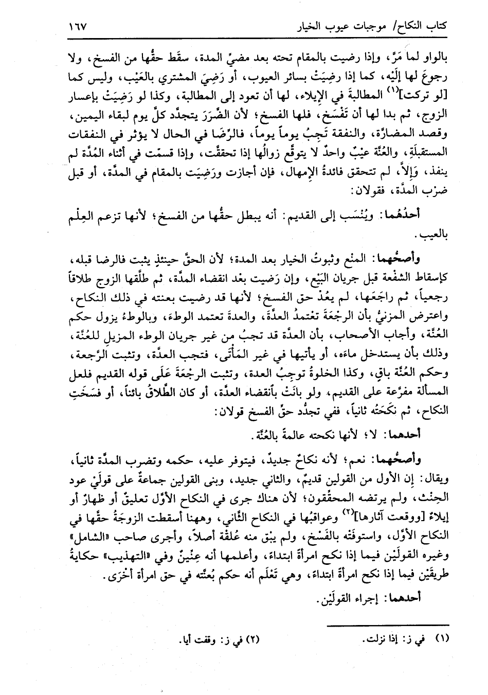 وأصحُّهما: المنْع وثبوتُ الخيار بعد المدة؛ لأن الحقَّ حينئذٍ يثبت فالرضا قبله، كإسقاط الشفْعة قبل جريان البَيْع، وإن رَضيت بعْد انقضاء المدَّة، ثم طلَّقها الزوج طلاقاً رجعياً، ثم راجَعَها، لم يعُدْ حق الفسخ؛ لأنها قد رضيت بعنته في ذلك النكاح، واعترض المزنيُّ بأن الرجْعَةَ تعْتمدُ العدَّةَ، والعدةَ تعتمد الوطءَ، وبالوطءُ يزول حكم العُنَّة، وأجاب الأصحاب، بأن العدَّة قد تجبُ من غير جريان الوطء المزيلِ للعُنَّة، وذلك بأن يستدخل ماءَه، أو يأتيها في غير المَاْتَى، فتجب العدَّة، وتثبت الرَّجعة، وحكم العُنَّة باقٍ، وكذا الخلوة توجِبُ العدة، وتثبت الرجْعَةَ عَلَى قوله القديم فلعل المسألة مفرَّعة على القديم، ولو بانَتْ بانقضاء العدَّة، أو كان الطَّلاق بائناً، أو فسَخَتِ النكاح، ثم نكَحَتُه ثانياً، ففي تجدُّد حقِّ الفسخ قولان: