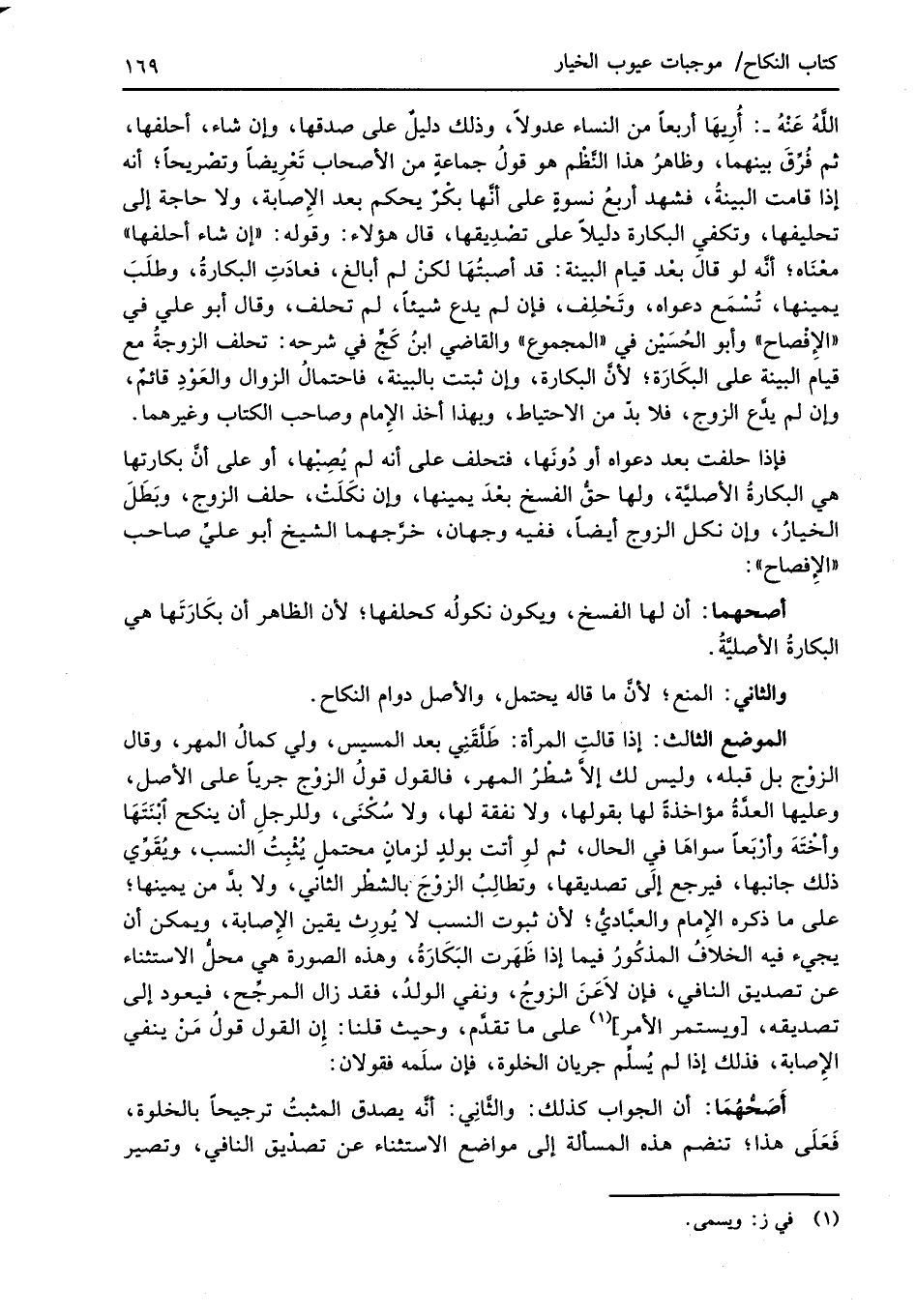 اللهُ عَنْهُ-: أُرِيهَا أربعاً من النساء عدولاً، وذلك دليلٌ على صدقها، وإن شاء، أحلفها، ثم فُرِّقَ بينهما، وظاهرُ هذا النَّظْم هو قولُ جماعةٍ من الأصحاب تَعْرِيضاً وتصْريحاً؛ أنه إذا قامت البينةُ، فشهد أربعُ نسوةٍ على أنَّها بكْرٌ يحكم بعد الإِصابة، ولا حاجة إلى تحليفها، وتكفي البكارة دليلاً على تصْدِيقها، قال هؤلاء: وقوله: "إن شاء أحلفها" معْنَاه؛ أنَّه لو قَالَ بعْد قيام البينة: قد أصبتُهَا لكنْ لم أبالغ، فعادَتِ البكارةُ، وطلَبَ يمينها، تُسْمَع دعواه، وتَحْلِف، فإن لم يدع شيئاً، لم تحلف، وقال أبو علي في "الإِفْصاح" وأبو الحُسَيْن في "المجموع" والقاضي ابنُ كَجٍّ في شرحه: تحلف الزوجةُ مع قيام البينة على البكَارَة؛ لأنَّ البكارة، وإن ثبتت بالبينة، فاحتمالُ الزوال والعَوْدِ قائمٌ، وإن لم يدَّع الزوج، فلا بدّ من الاحتياط، وبهذا أخذ الإِمام وصاحب الكتاب وغيرهما.