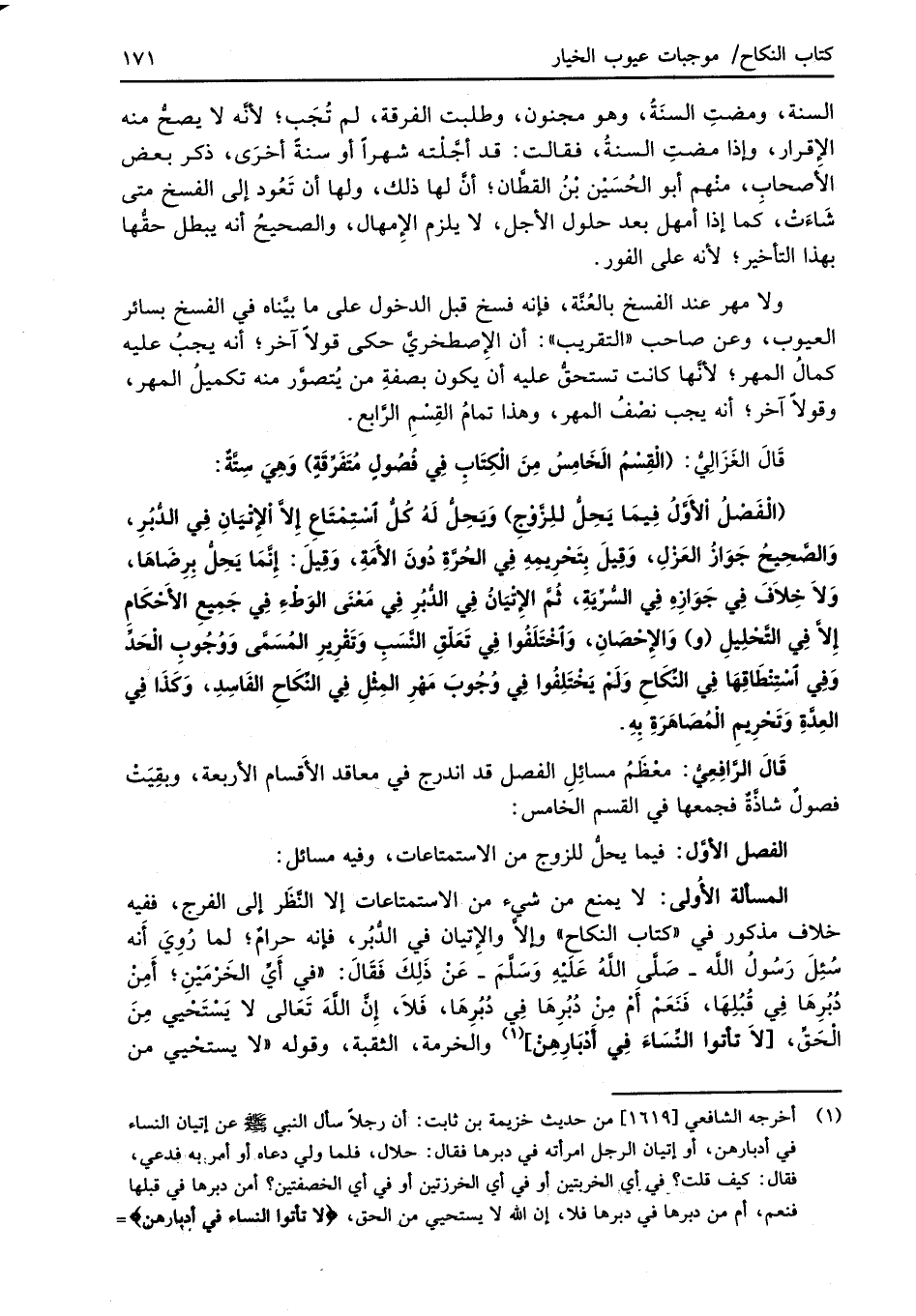 قَالَ الغَزَالِيُّ: (الْقِسْم الَخَامِسُ مِنَ الْكِتَابِ في فُصُولٍ مُتَفَرِّقَةٍ) وَهِيَ سِتَّةٌ: