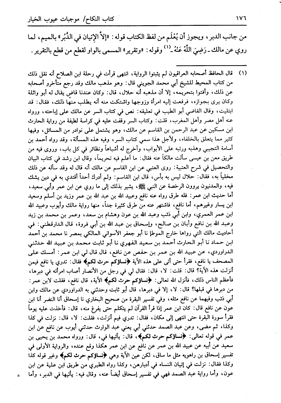 (¬1) قال الحافظ أصحابه العراقيون لم يثبتوا الرواية، انتهى قرأت في رحلة ابن الصلاح أنه نقل ذلك من كتاب المحيط للشيخ أبي محمد الجويني قال: وهو مذهب مالك وقد رجع متأخرو أصحابه عن ذلك، وأفتوا بتحريمه، إلا أن مذهبه أنه حلال، قال: وكان عندنا قاضٍ يقال له أبو واثلة وكان يرى بجوازه، فرفعت إليه امرأة وزوجها واشتكت منه أنه يطلب منها ذلك، فقال: قد ابتليت، وقال القاضي أبو الطيب في تعليقه: نص في كتاب السر عن مالك على إباحته، ورواه عنه أهل مصر وأهل المغرب، قلت: وكتاب السر وقفت عليه في كراسة لطيفة من رواية الحارث ابن مسكين عن عبد الرحمن بن القاسم عن مالك، وهو يشتمل على نوادر من المسائل، وفيها كثير مما يتعلق بالخلفاء، ولأجل هذا سمي كتاب السر، وفيه هذه المسألة، وقد رواه أحمد بن أسامة التجيبي وهذبه ورتبة على الأبواب، وأخرج له أشباهاً ونظائر في كل باب، وروى فيه من طريق معن بن عيسى سألت مالكاً عنه فقال: ما أعلم فيه تحريماً، وقال ابن رشد في كتاب البيان والتحصيل في شرح العتبية: روى العتبي عن ابن القاسم عن مالك أنه قال له وقد سأله عن ذلك مخلياً به، فقال: حلال ليس به بأس، قال ابن القاسم: ولم أدرك أحداً أقتدي به في دين لك فيه، والمدنيون يروون الرخصة عن النبي -صلى الله عليه وسلم-، يشعر بذلك إلى ما روي عن ابن عمر وأبي سعيد، أما حديث ابن عمر: فله طرق رواه عنه نافع وعبد الله بن عبد الله بن عمر وزيد بن أسلم وسعيد ابن يسار وغيرهم، أما نافع، فاشتهر عنه من طرق كثيرة جداً، منها رواية مالك وأيوب وعبد الله ابن عمر العمري، وابن أبي ذئب وعبد الله بن عون وهشام بن سعد، وعمر بن محمد بن زيد وعبد الله بن نافع وأبان بن صالح، وإسحاق بن عبد الله بن أبي فروة، قال الدارقطني: في أحاديث مالك التي رواها خارج الموطإ نا أبو جعفر الأسواني المالكي بمصر نا محمد بن أحمد ابن حماد نا أبو الحارث أحمد بن سعيد الفهري نا أبو ثابت محمد بن عبيد الله حدثني الدراوردي، عن عبيد الله بن عمر بن حفص عن نافع، قال قال لي ابن عمر: أمسك على المصحف يا نافع، فقرأ حتى أتى على هذه الآية {نِسَاؤُكُمْ حَرْثٌ لَكُمْ} فقال: تدري يا نافع فيمن أنزلت هذه الآية؟ قال: قلت: لا، قال: فقال لي في رجل من الأنصار أصاب امرأته في دبرها، فأعظم الناس ذلك، فأنزل الله تعالى: {نِسَاؤُكُمْ حَرْثٌ لَكُمْ} الآية، قال نافع، فقلت لابن عمر: من دبرها في قبلها؟ قال: لا، إلا في دبرها، قال أبو ثابت وحدثني به الدراوردي عن مالك وابن أبي ذئب وفيهما عن نافع مثله، وفي تفسير البقرة من صحيح البخاري نا إسحاق أنا النضر أنا ابن عون عن نافع قال: كان ابن عمر إذا قرأ القرآن لم يتكلم حتى يفرغ منه، قال: فأخذت عليه يوماً فقرأ سورة البقرة حتى انتهى إلى مكان، فقال: تدري فيم أنزلت، فقلت: لا، قال: نزلت في كذا وكذا، ثم مضى، وعن عبد الصمد حدثني أبي يعني عبد الوارث حدثني أيوب عن نافع عن ابن عمر في قوله تعالى: {نِسَاؤُكُمْ حَرْثٌ لَكُمْ}، قال: يأتيها في، قال: ورواه محمد بن يحيى بن سعيد عن أبيه عن عبيد الله بن عمر عن نافع عن ابن عمر هكذا وقع عنده، والرواية الأولى في تفسير إسحاق بن راهويه مثل ما ساق، لكن عين الآية وهي {نِسَاؤُكُمْ حَرْثٌ لَكُمْ}، وغير قوله كذا وكذا فقال: نزلت في إتيان النساء في أدبارهن، وكذا رواه الطبري من طريق ابن علية عن ابن عون، وأما رواية عبد الصمد فهي في تفسير إسحاق أيضاً عنه، وقال فيه: يأتيها في الدبر، وأما =