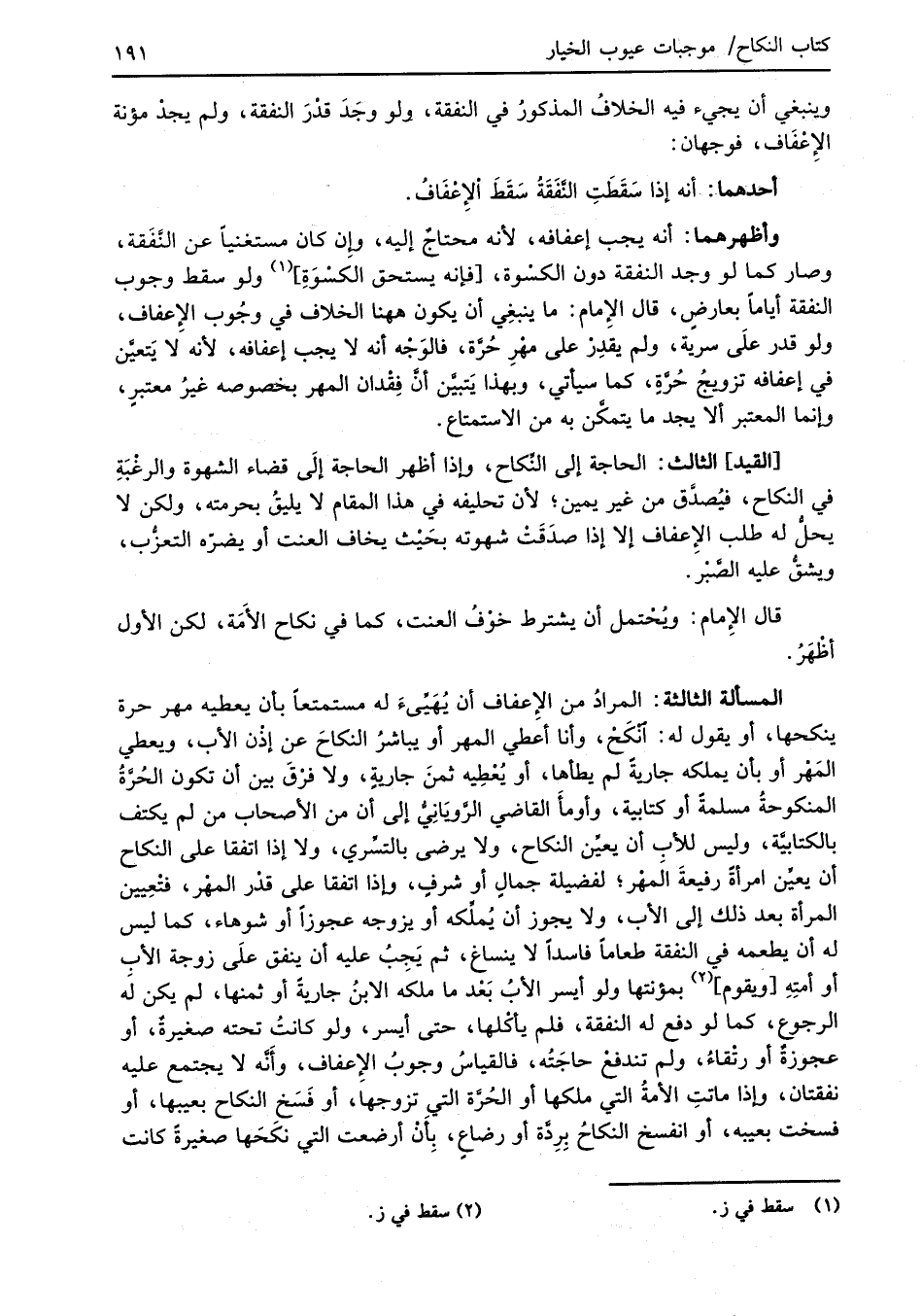 وأظهرهما: أنه يجب إعفافه؛ لأنه محتاجٌ إليه، وِإن كان مستغنياً عن النَّفَقة، وصار كما لو وجد النفقة دون الكسْوة، [فإنه يستحق الكسْوَةِ] (¬1) ولو سقط وجوب النفقة أياماً بعارضٍ، قال الإِمام: ما ينبغِي أن يكون ههنا الخلاف في وجُوب الإعفاف، ولو قدر علَى سرية، ولم يقَدِرْ على مهْرِ حُرَّة، فالوَجْه أنه لا يجب إعفافه؛ لأنهَ لا يَتعيَّن في إعفافه تزويجُ حُرَّةٍ، كما سيأتي، وبهذا يَتبيَّن أنَّ فِقْدان المهر بخصوصه غيرُ معتبرٍ، وإنما المعتبر ألا يجد ما يتمكَّن به من الاستمتاع.