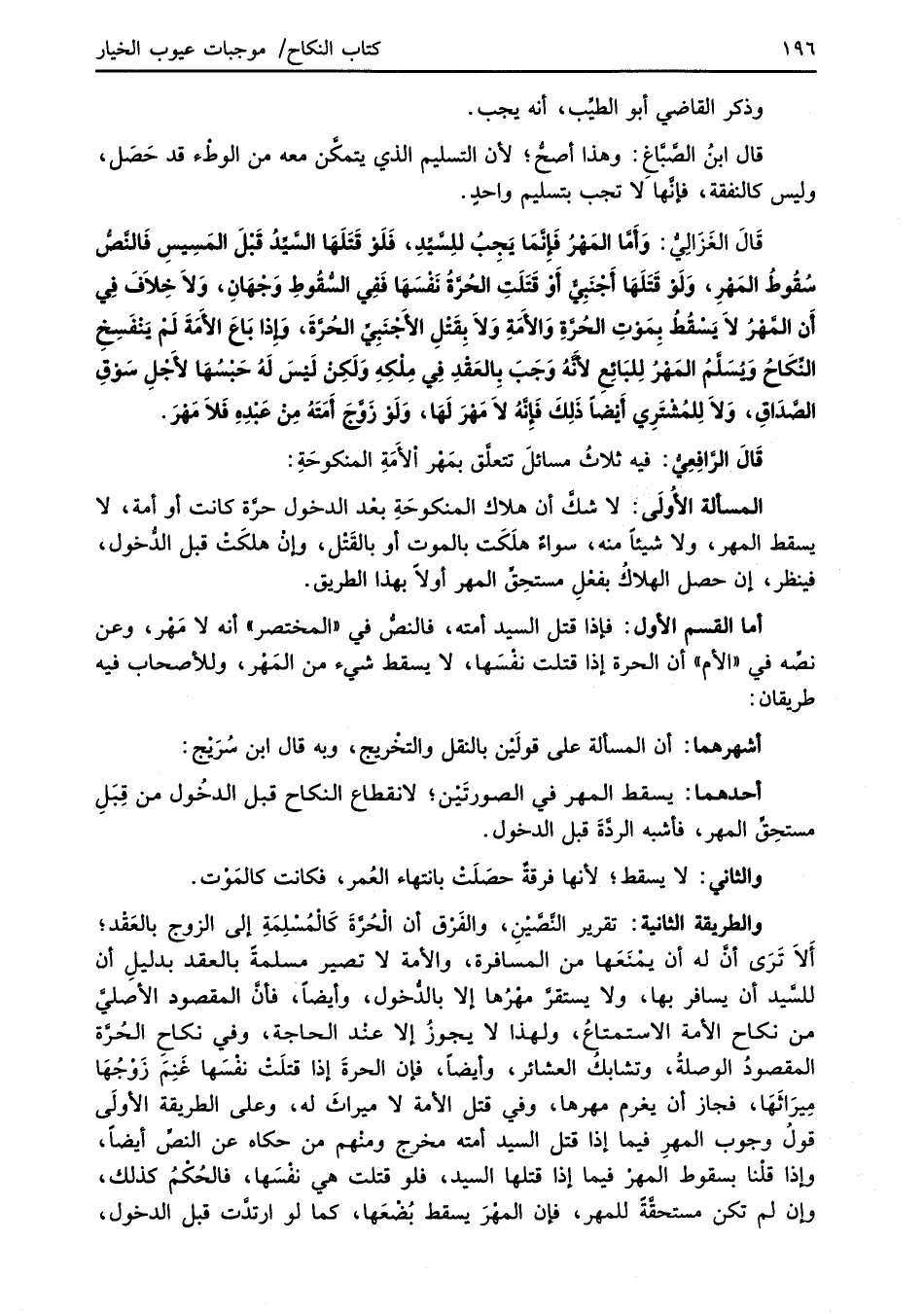 قَالَ الغَزَالِيُّ: وَأَمَّا المَهْرُ فَإنَّما يَجِبُ للسَّيِّدِ، فَلَوْ قَتَلَهَا السَّيِّدُ قَبلَ المَسِيسِ فَالنَّصُّ سُقُوطُ المَهْرِ، وَلَوْ قَتَلَهَا أَجْنَبِيُّ أَوْ قَتَلَتِ الحُرَّةُ نَفْسَهَا فَفِي السُّقُوطِ وَجْهَانِ، وَلاَ خِلاَفَ فِي أَن المَهْرُ لاَ يَسْقُطُ بِمَوْتِ الحُرَّةِ وَالأَمَةِ وَلاَ بِقَتْلِ الأجْنَبِيِّ الحُرَّةَ، وَإِذا بَاعَ الأَمَةَ لَمْ يَنْفَسِخِ النِّكَاحُ وَيسَلَّمُ الْمَهْرُ لِلبَائِعِ لأَنَّهُ وَجَبَ بِالعَقْدِ فِي مِلْكِهِ وَلَكِنْ لَيْسَ لَهُ حَبْسُهَا لأَجْلِ سَوْقِ الصَّدَاقِ، وَلاَ لِلمُشْتَرِي أَيْضاً ذَلِكَ فَإنَّهُ لاَ مَهْرَ لَهَا، وَلَوْ زَوَّجَ أَمَتَهُ مِنْ عَبْدِهِ فلاَ مَهْرَ.